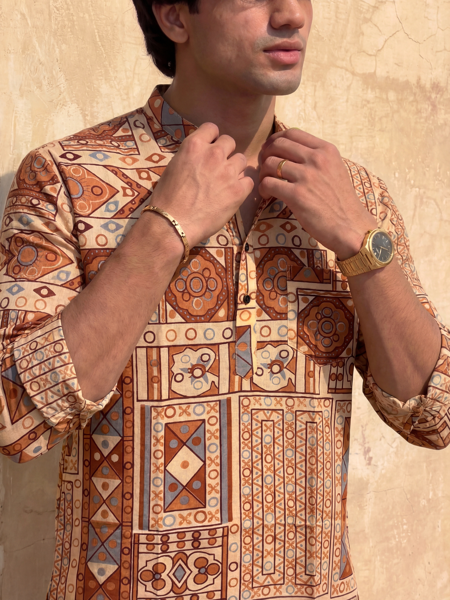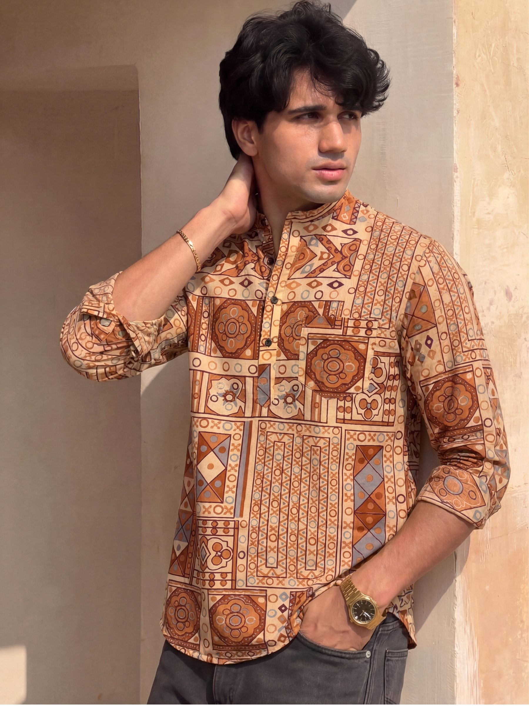 Step into style with Geometric Charm by Jaipuri Crown – a printed Short Kurta featuring an eye-catching pattern in earthy tones of rust and blue on a soft cream base. Made from 100% Sanganeri cotton, this Kurta is designed to provide maximum comfort while keeping you fashionable. Ideal for casual outings, festive gatherings, or everyday wear, it adds a unique flair to your wardrobe.