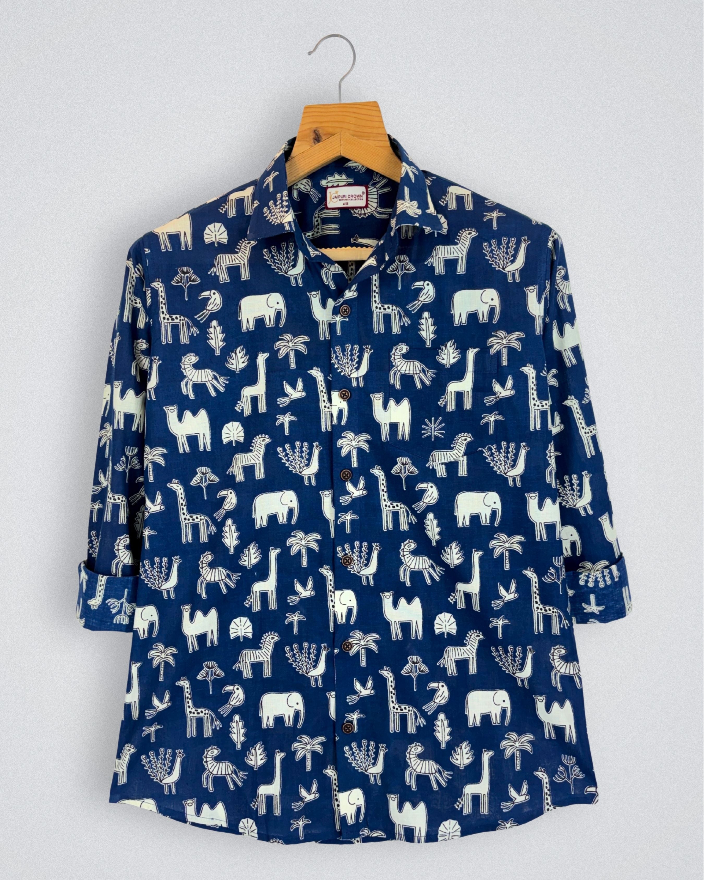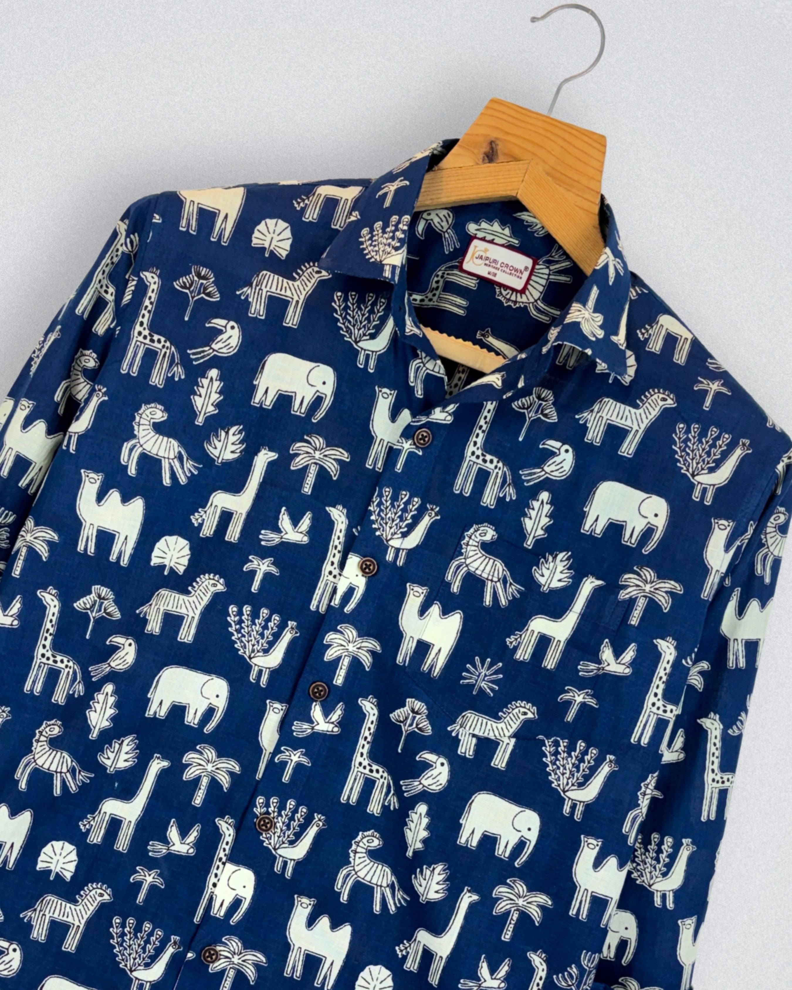 Step into the wild with Wildlife Wonders by Jaipuri Crown – a striking Full sleeve cotton shirt featuring a playful animal print in white against a deep blue background. Made from 100% Sanganeri cotton, this shirt offers incredible softness and breathability, making it ideal for casual outings, weekend getaways, or simply lounging in style.