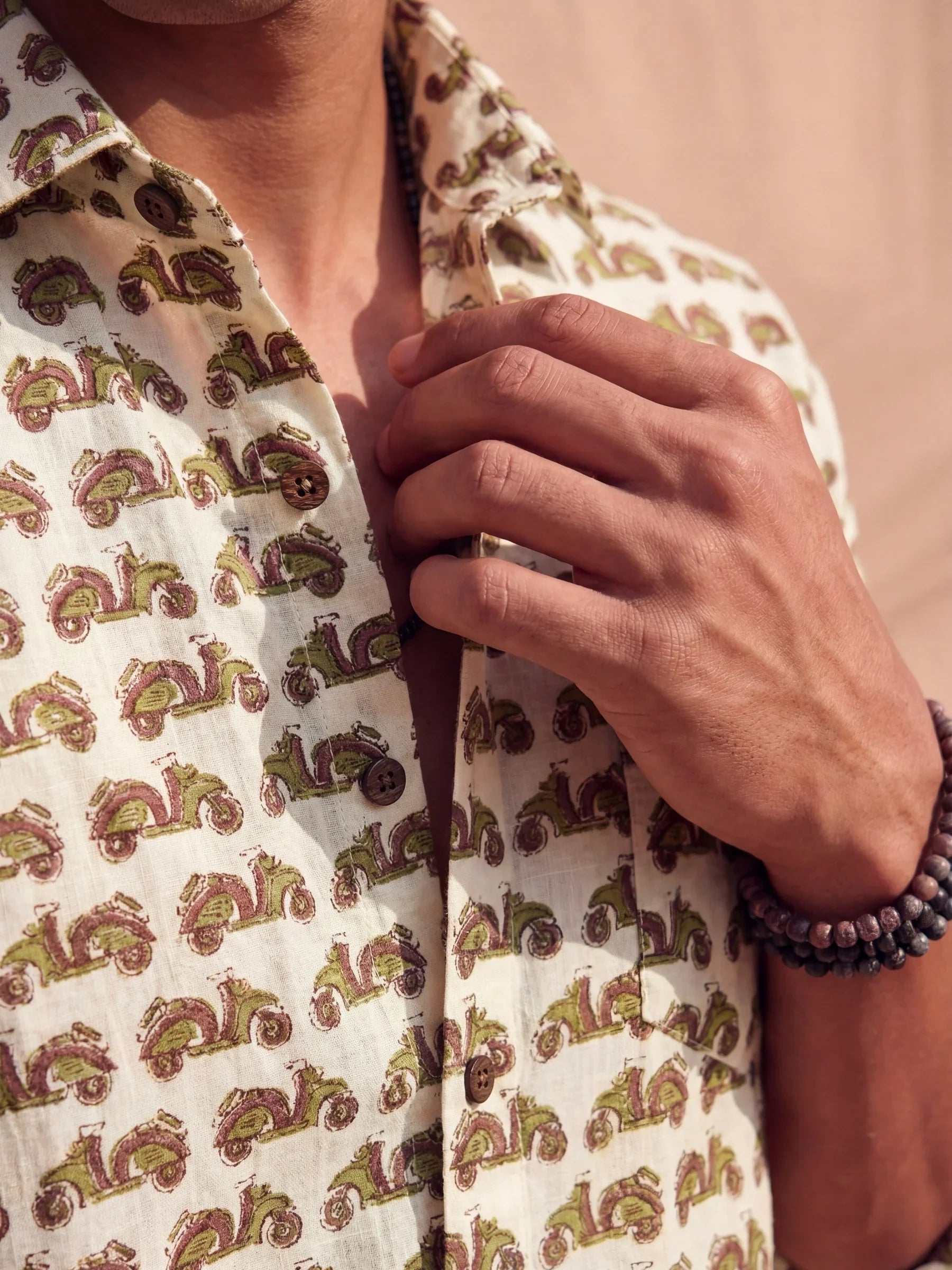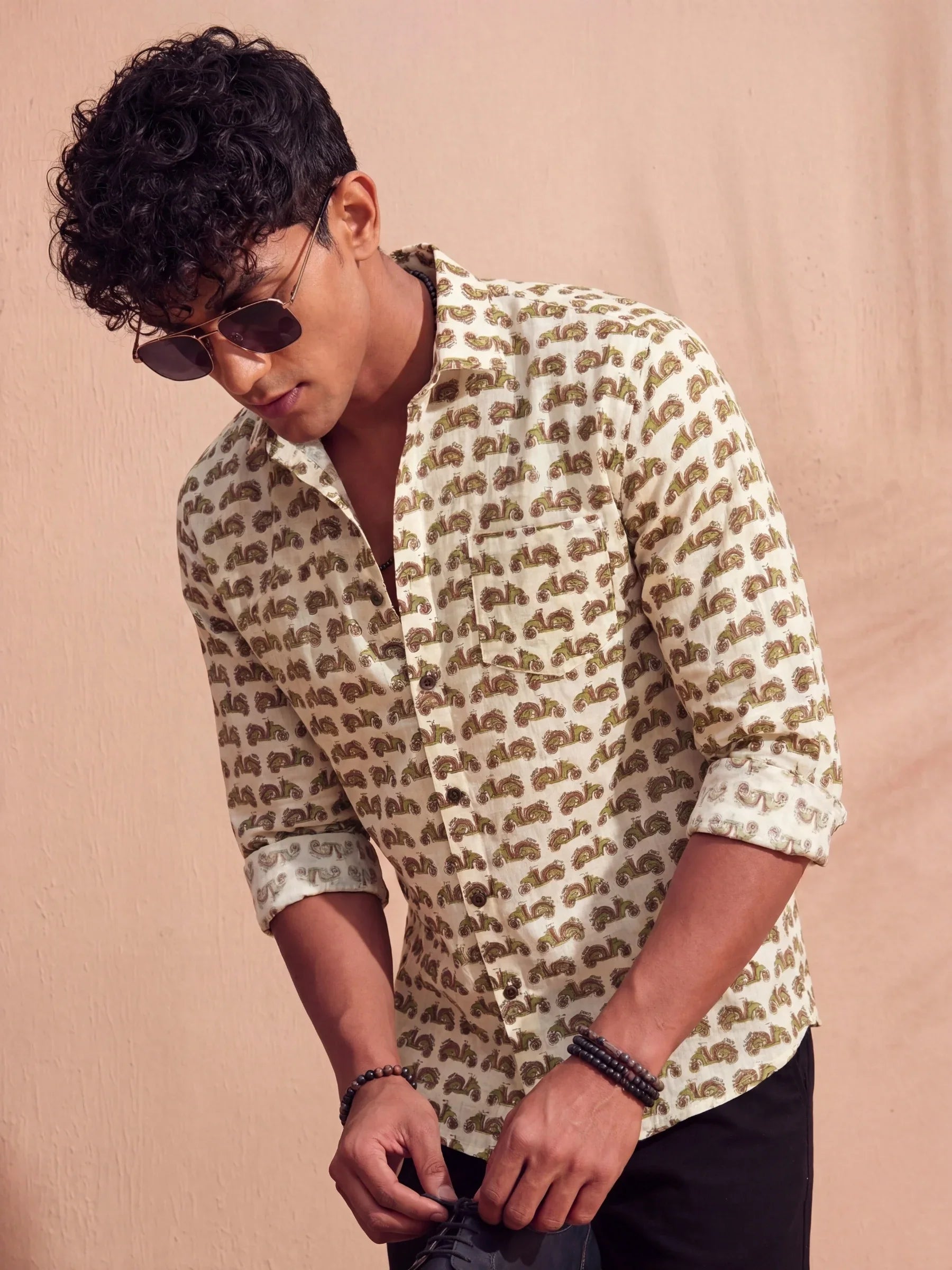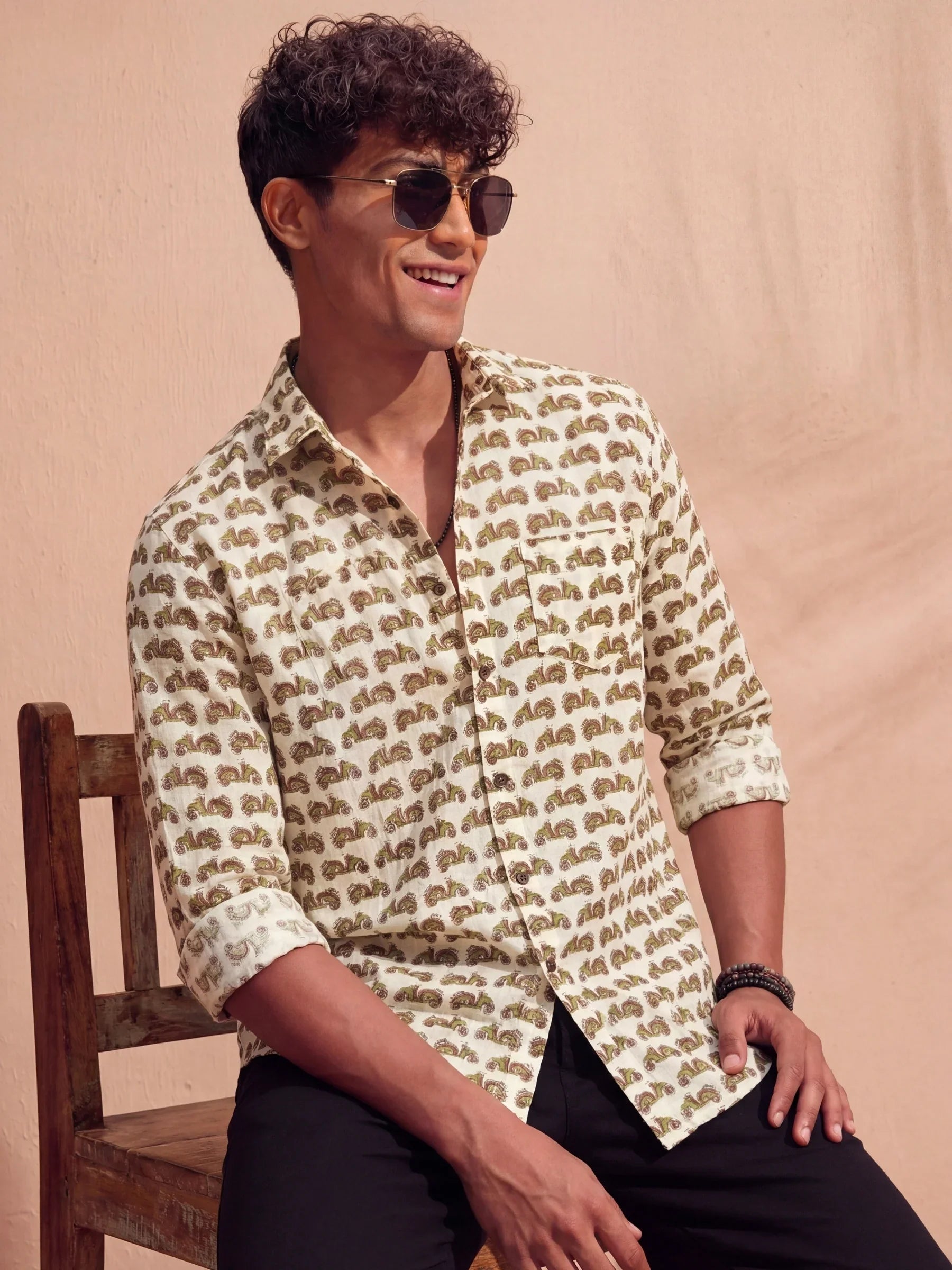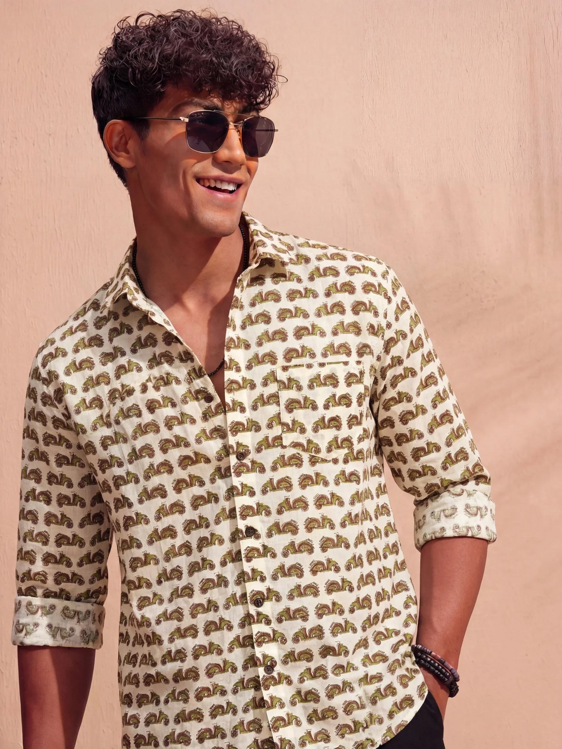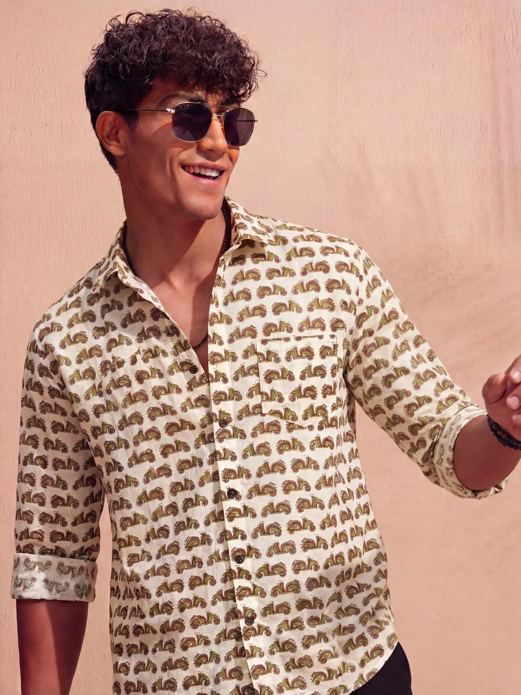 Rev up your style with the Scooter Style shirt by Jaipuri Crown – a trendy Full Sleeve cotton shirt featuring a playful scooter print in olive and brown on a cream backdrop. Made from 100% pure cotton, this shirt ensures a soft touch while keeping you cool and comfortable. Ideal for casual outings, this shirt adds a unique flair to your wardrobe.