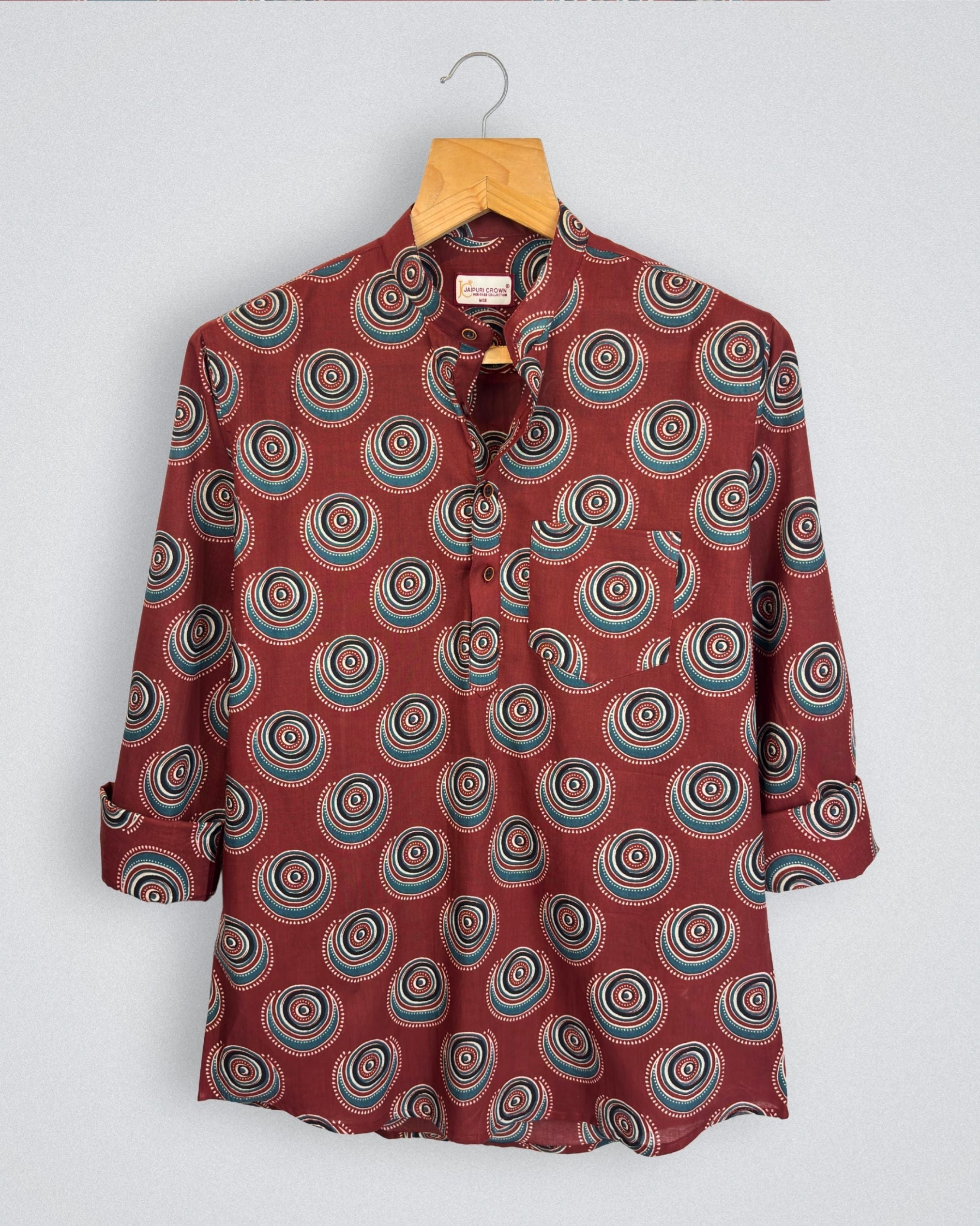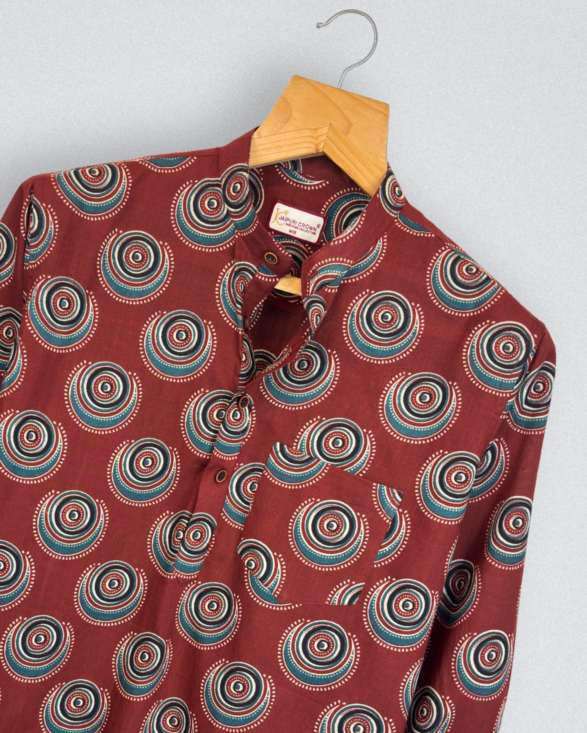 Step into style with Spiral Harmony by Jaipuri Crown – a trendy Short Kurta featuring an eye-catching spiral print in earthy tones on a rich maroon background. Made from 100% Sanganeri cotton, this Kurta is designed for comfort and breathability, making it ideal for casual outings, festive occasions, or everyday wear.