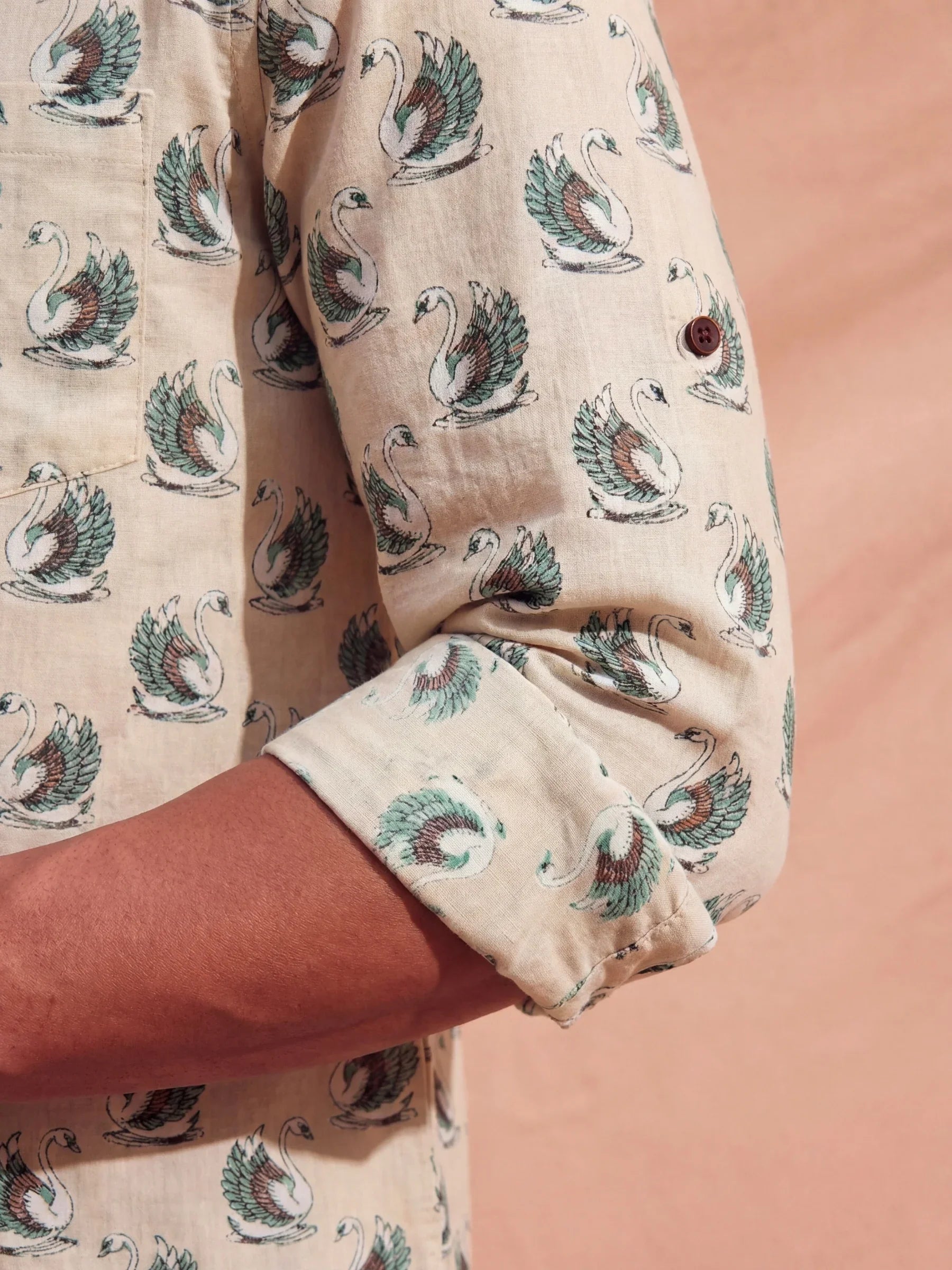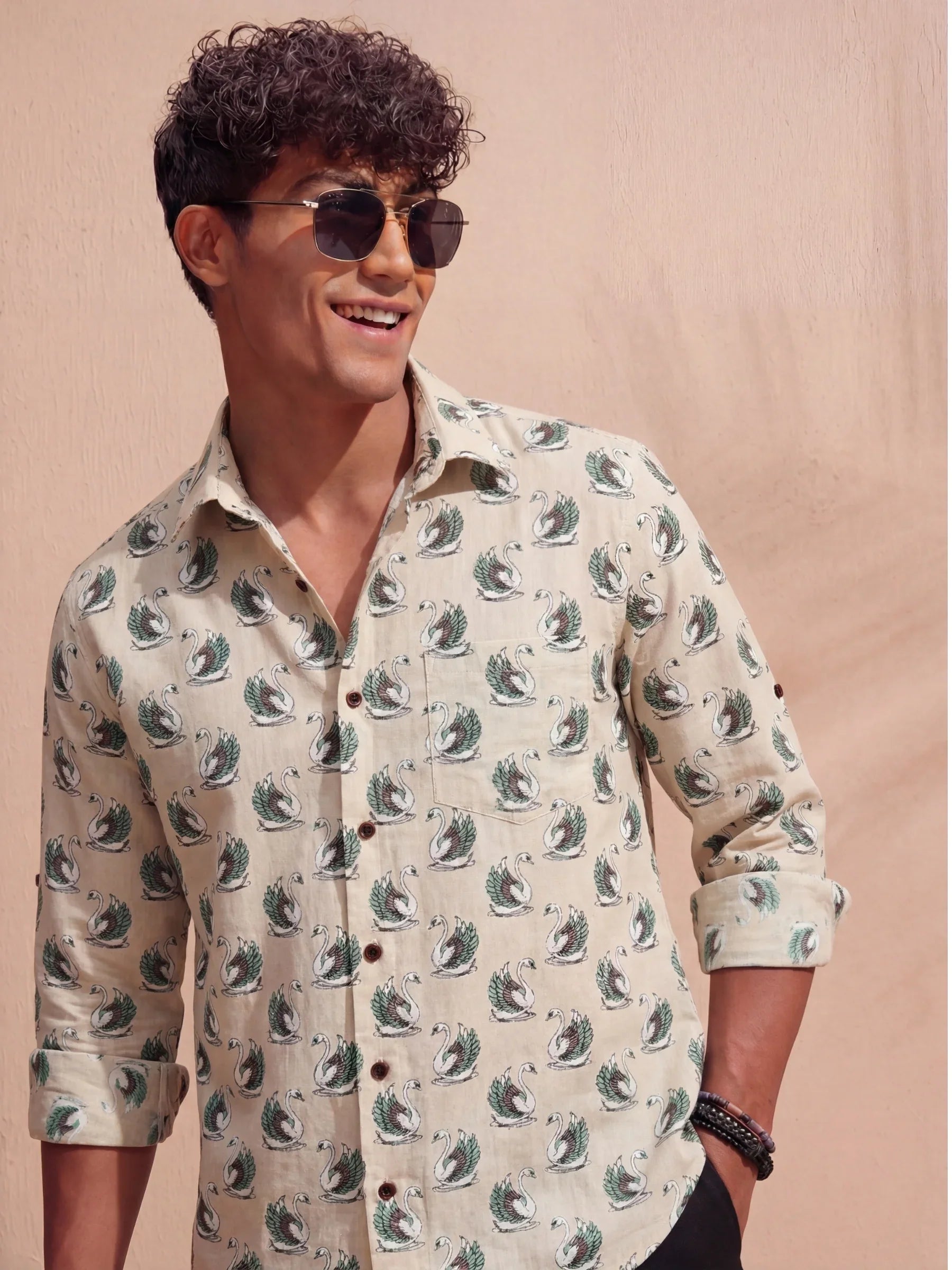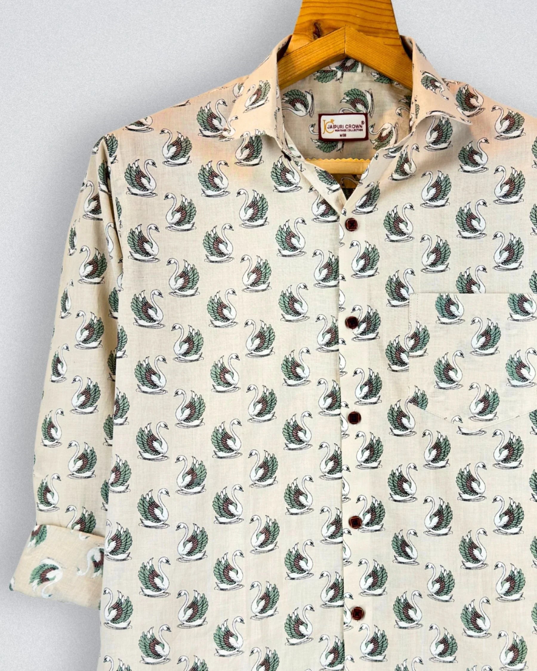 Step into style with Swan Dance by Jaipuri Crown – a stunning Full sleeve cotton shirt featuring a unique swan print in shades of green against a soft beige backdrop. Made from 100% high-quality cotton, this shirt promises a comfortable and breathable fit, ideal for casual gatherings, outings, or laid-back weekends.