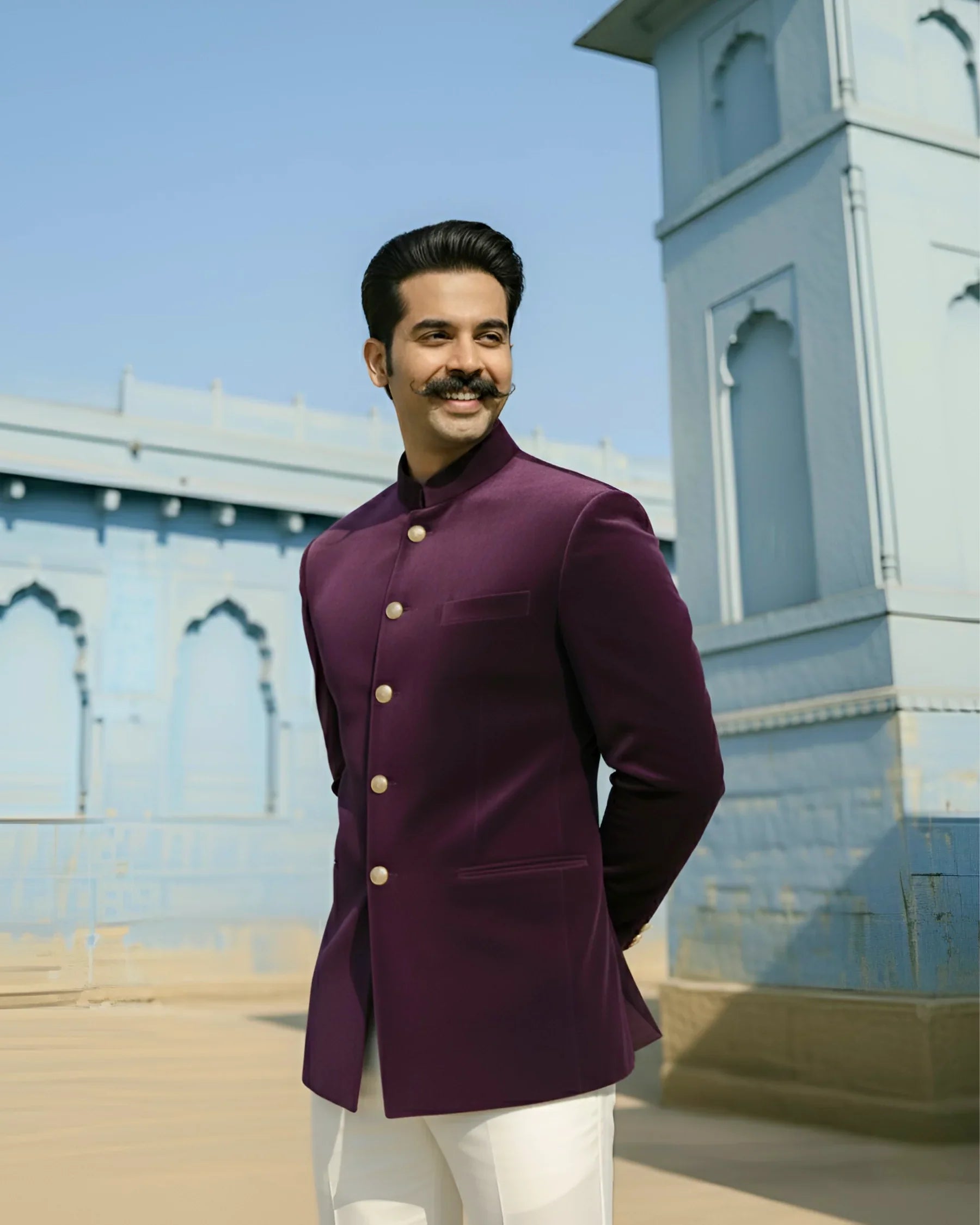 The Modern Jodhpuri - Wine by Jaipuri Crown is the ultimate expression of style, elegance, and sophistication. Crafted in a rich wine hue, inspired by deep purple shades, this Bandhgala is perfect for formal occasions and celebrations where you want to make a bold yet refined statement.