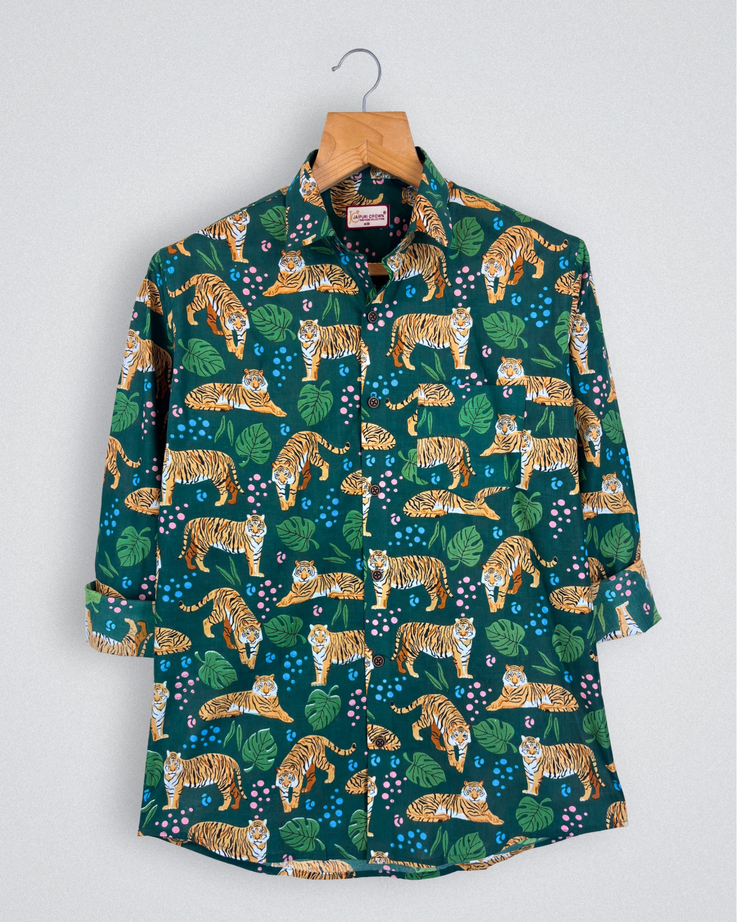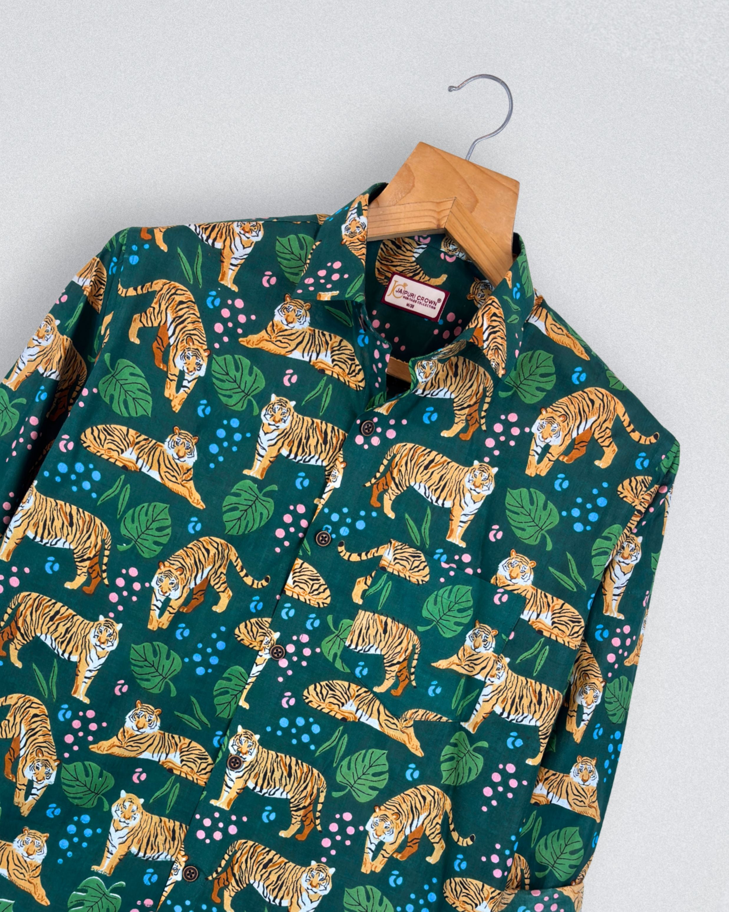 Step into the wild with Tiger Roar by Jaipuri Crown – a striking Full sleeve cotton shirt showcasing an eye-catching tiger print in vibrant shades of gold and green. Made from 100% Sanganeri cotton, this shirt ensures a soft, breathable feel, making it perfect for casual gatherings, outdoor adventures, or laid-back weekends.