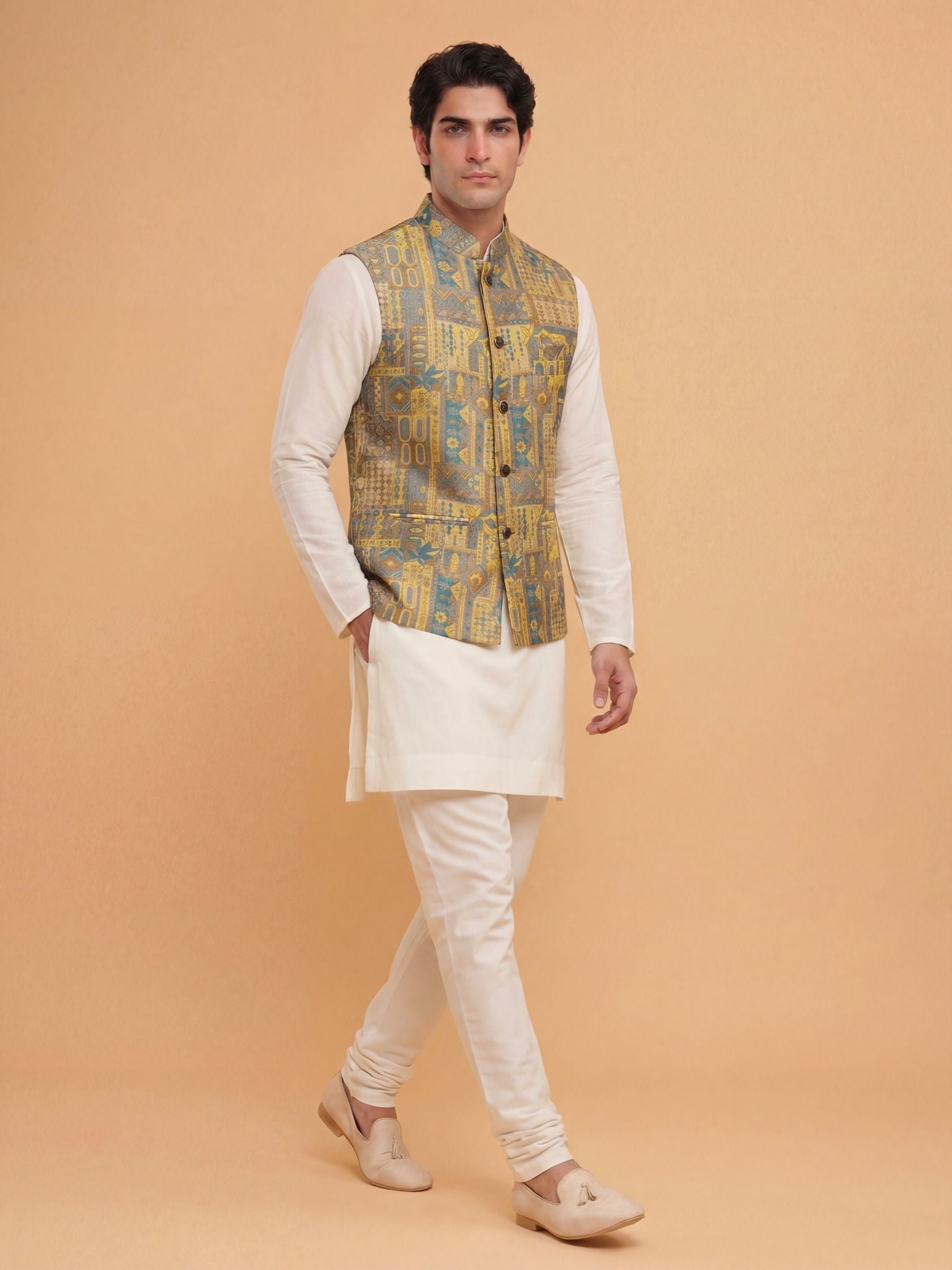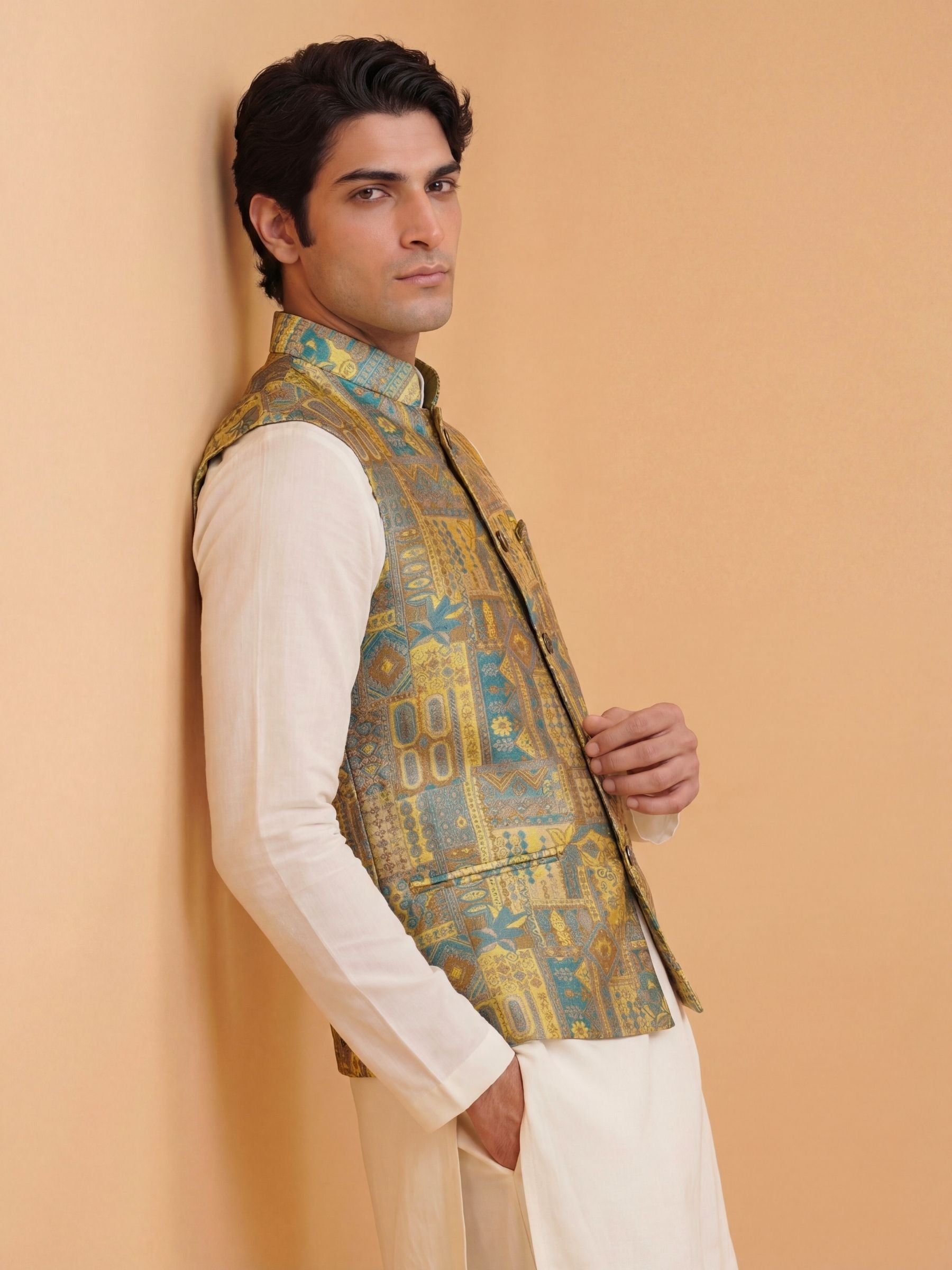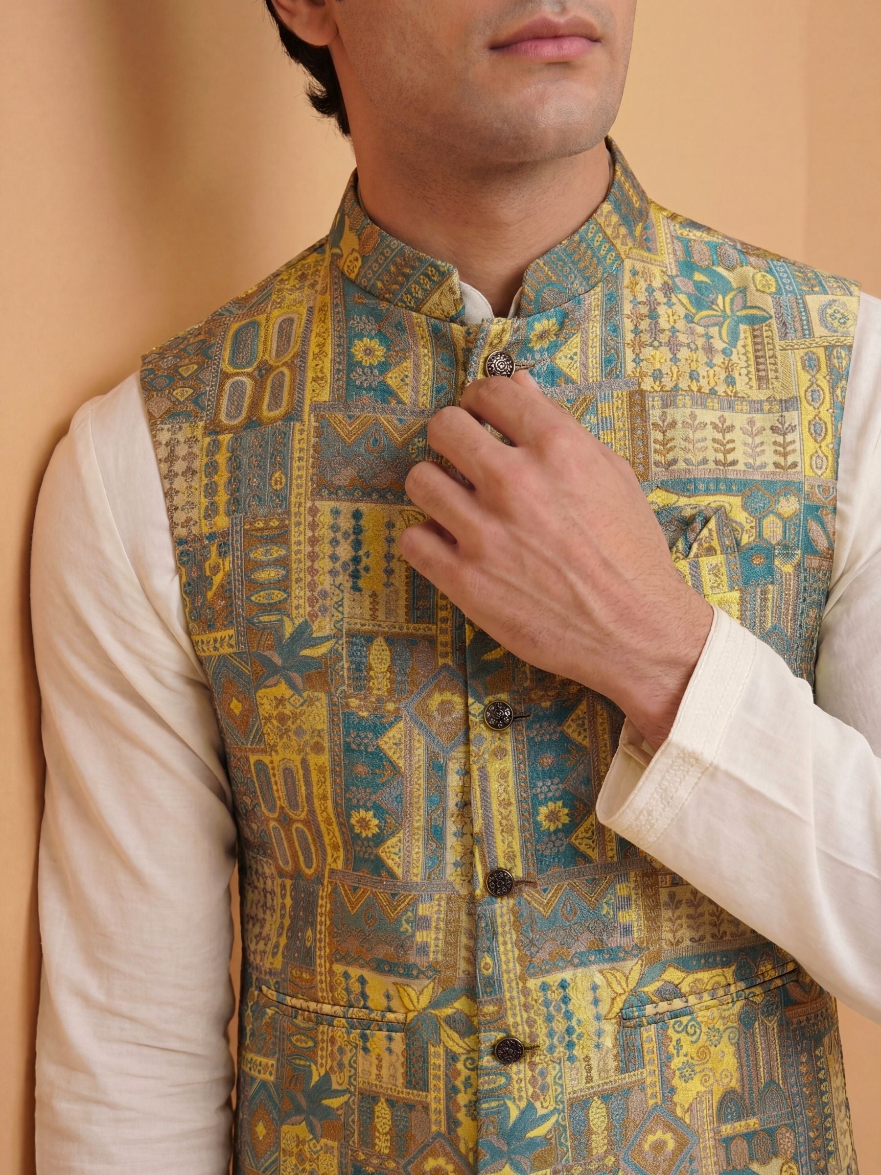 Make a heritage statement with the विभूति (Vibhuti) Heritage Patchwork Jacquard Nehru Jacket. Inspired by the richness of Indian textile storytelling, this Modi Jacket features an intricate patchwork-style jacquard weave combining antique gold and deep teal motifs into a detailed tapestry of geometric and floral heritage elements.