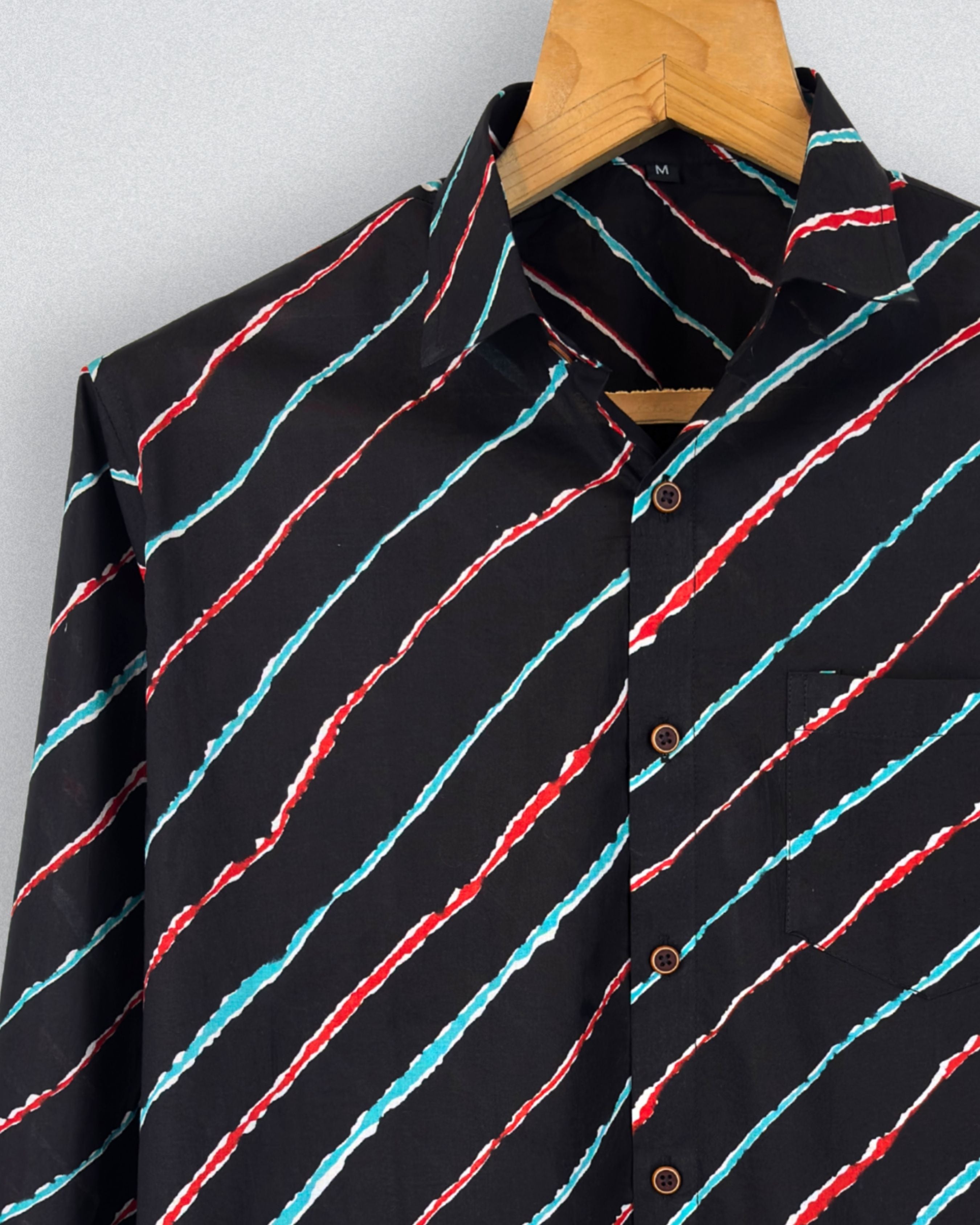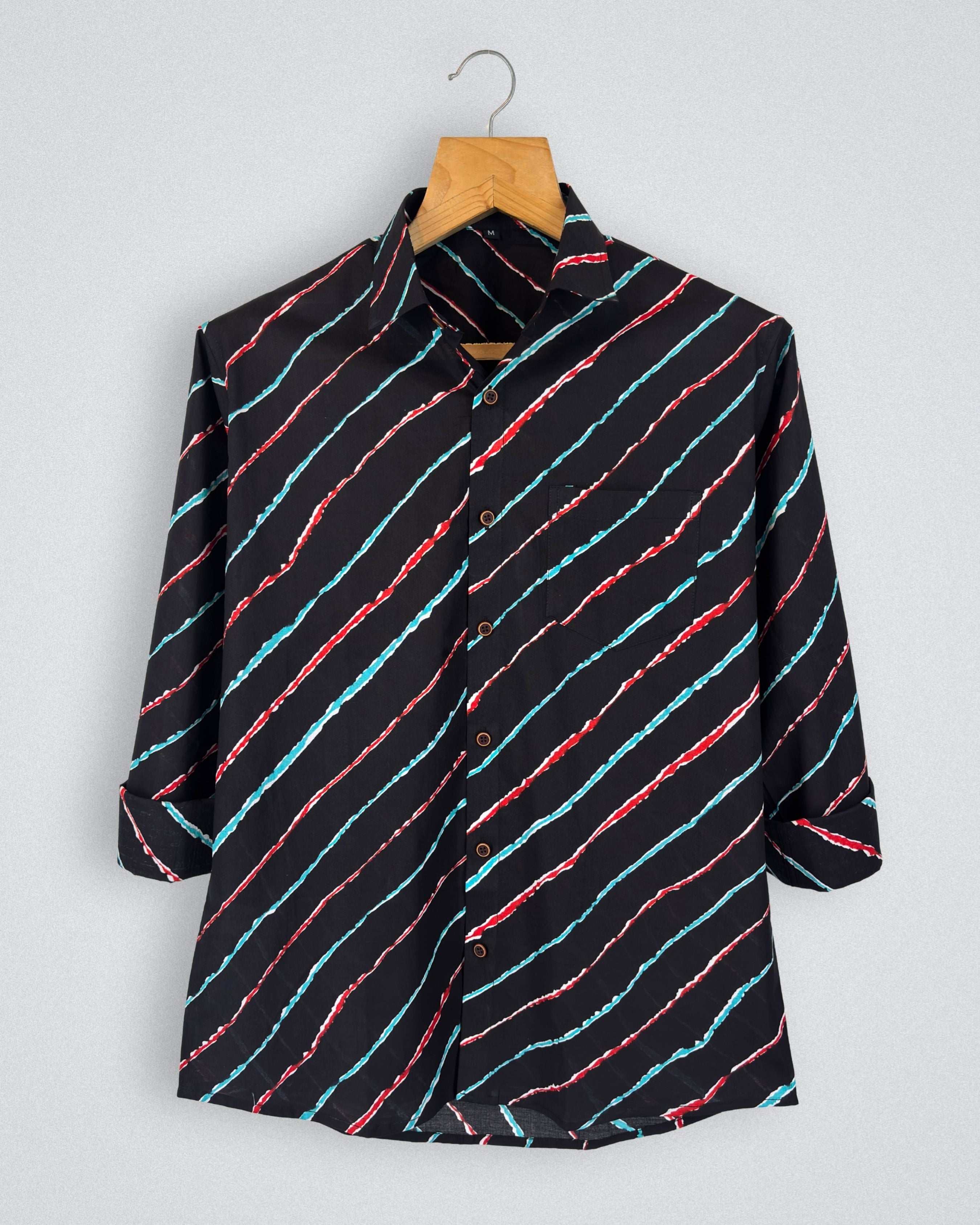 Step up your style game with Vibrant Stripes by Jaipuri Crown – a chic Full sleeve cotton shirt featuring a lively striped pattern in red, blue, and white on a bold black backdrop. Made from 100% breathable cotton, this shirt ensures comfort and style, making it a great choice for casual gatherings, brunches, or weekend outings.
