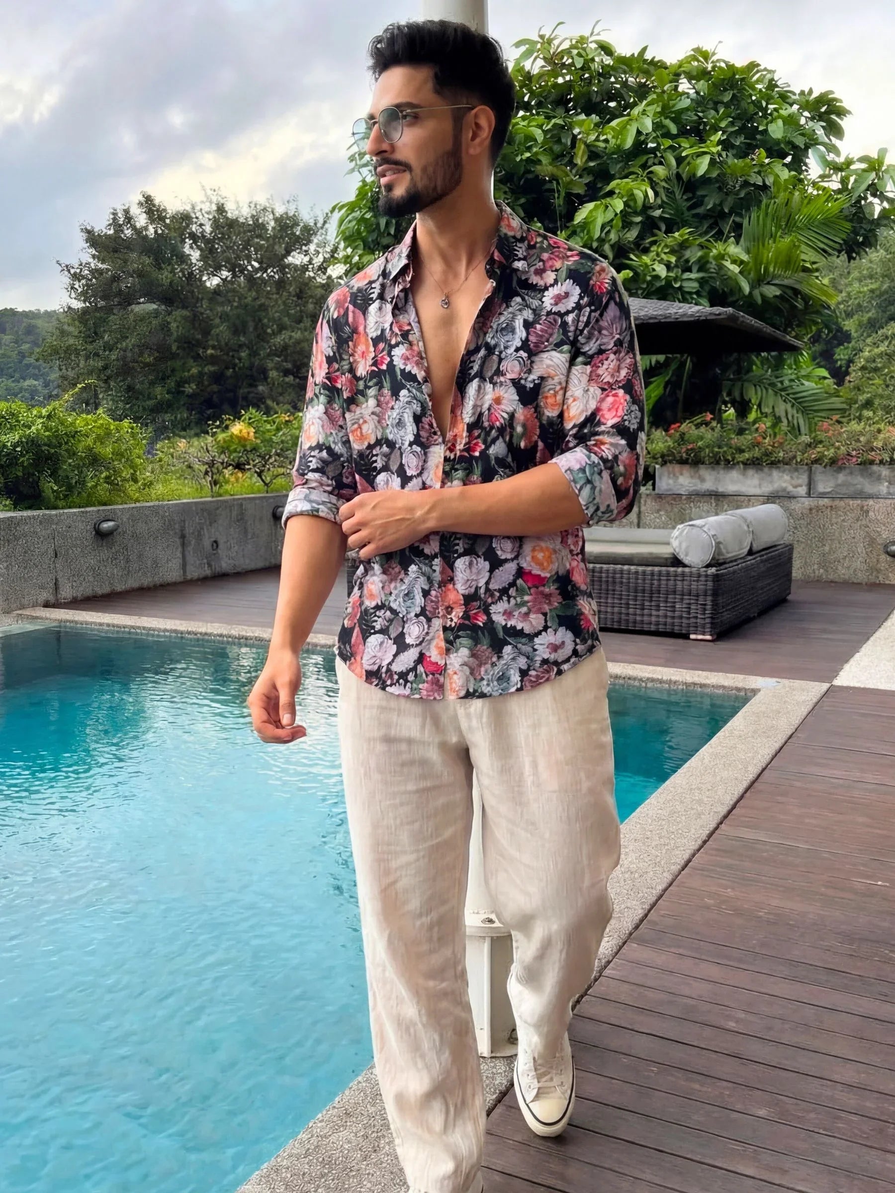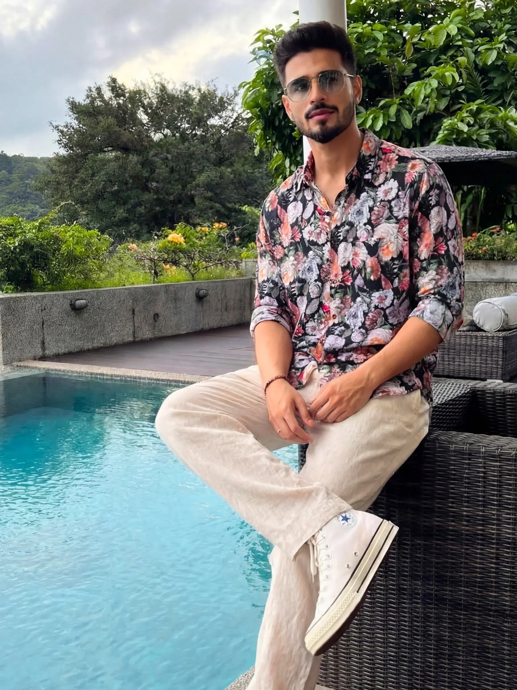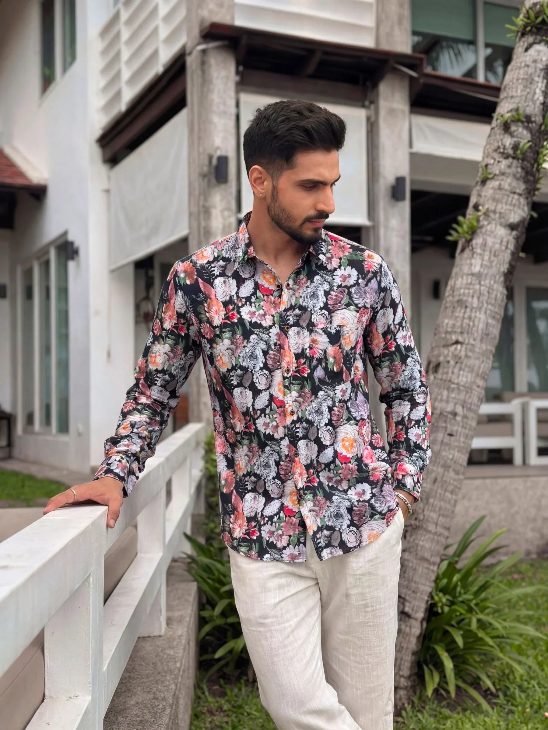 Bring timeless charm to your wardrobe with the Vintage Bloom shirt by Jaipuri Crown. With a rich black base and a faded floral print in soft whites, dusty pinks, greens, and rust orange, this shirt blends heritage vibes with modern elegance. Crafted from premium satin blend fabric, it offers a luxurious sheen and all-day ease — ideal for dinners, cultural events, or festive days.