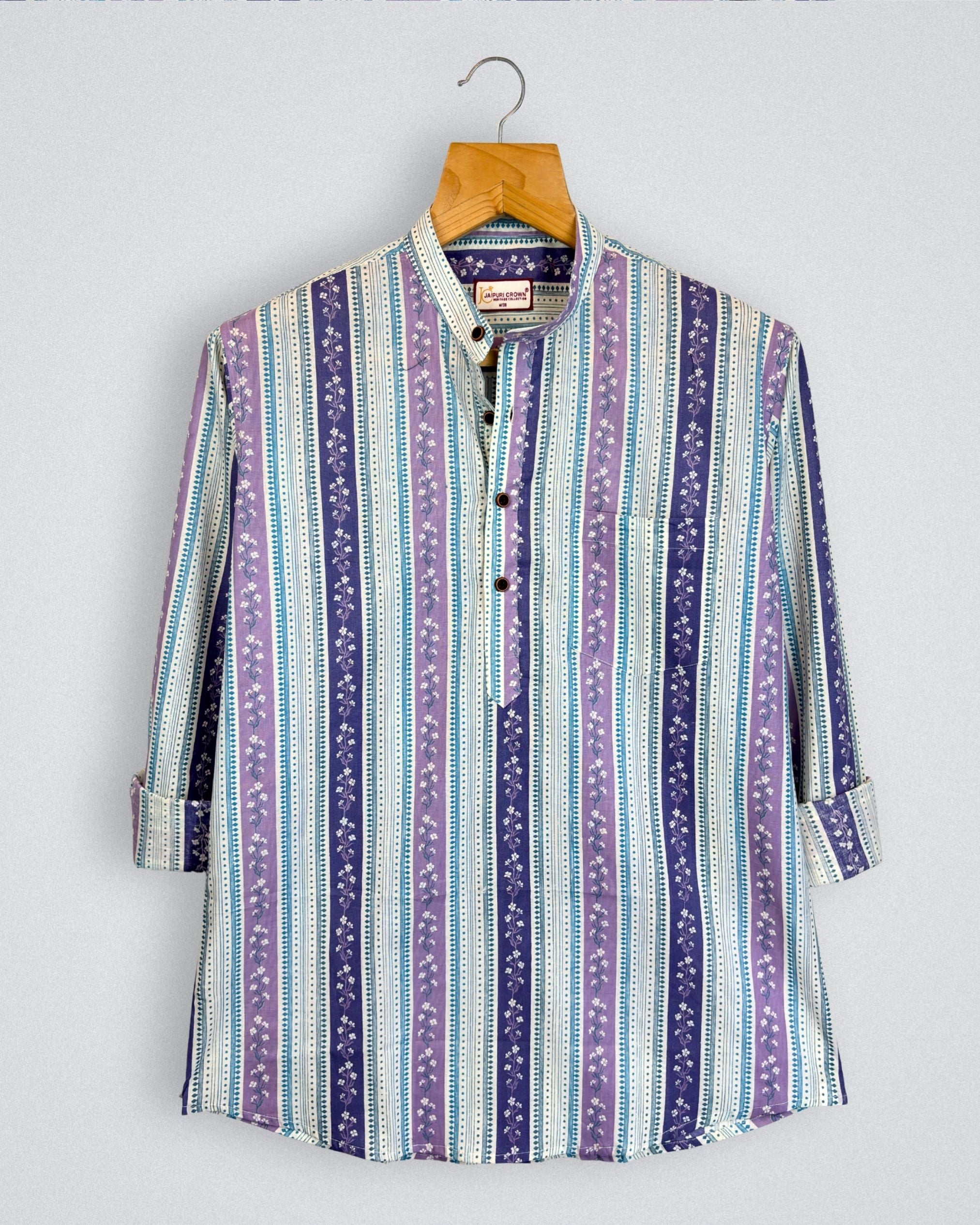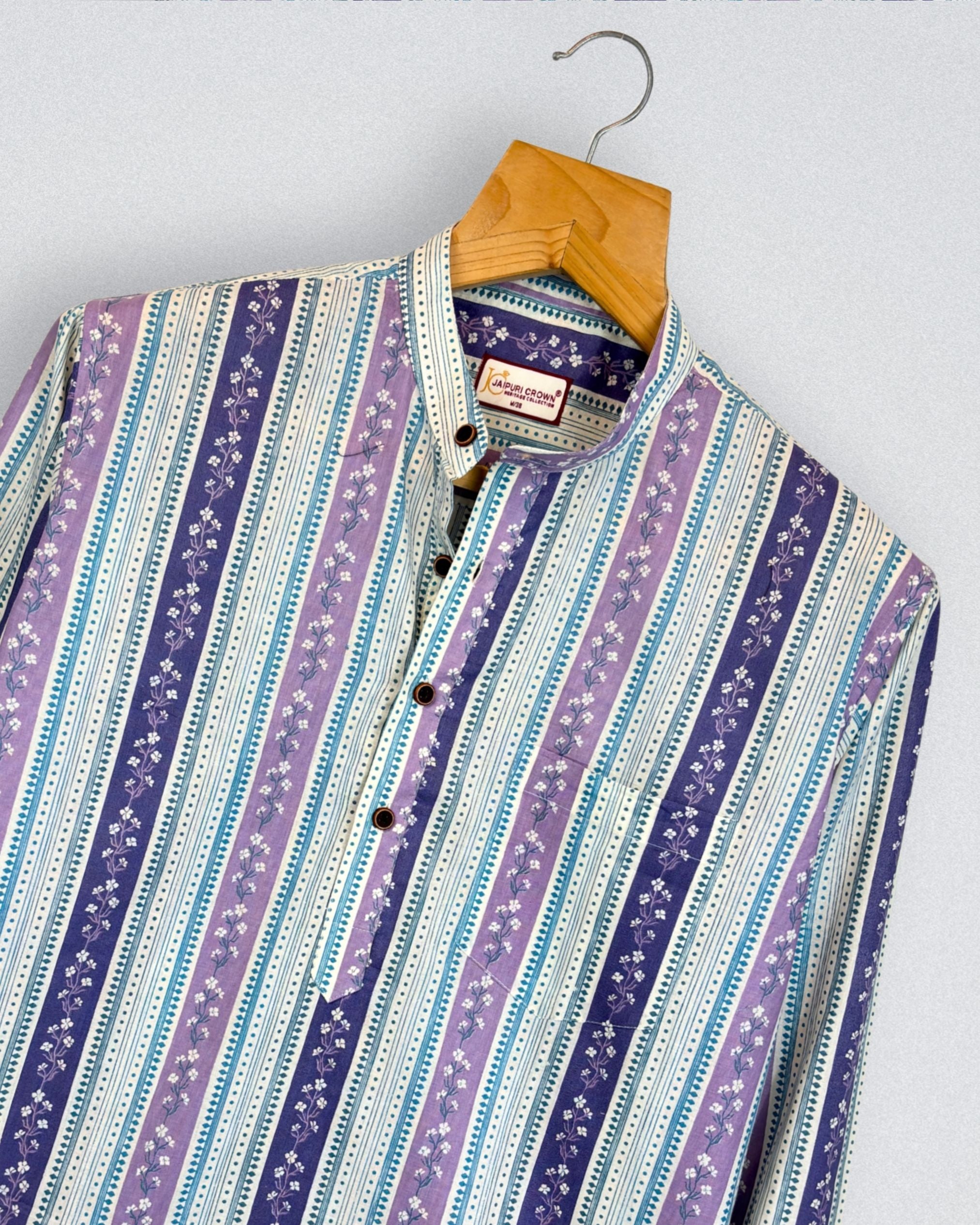 Step into a world of elegance with Floral Symphony by Jaipuri Crown – a chic Short Kurta featuring a delightful floral and striped print in shades of violet, lavender, and teal. Made from 100% Sanganeri cotton, this Kurta ensures a soft, breathable fit, perfect for any casual occasion, family gatherings, or festive celebrations.