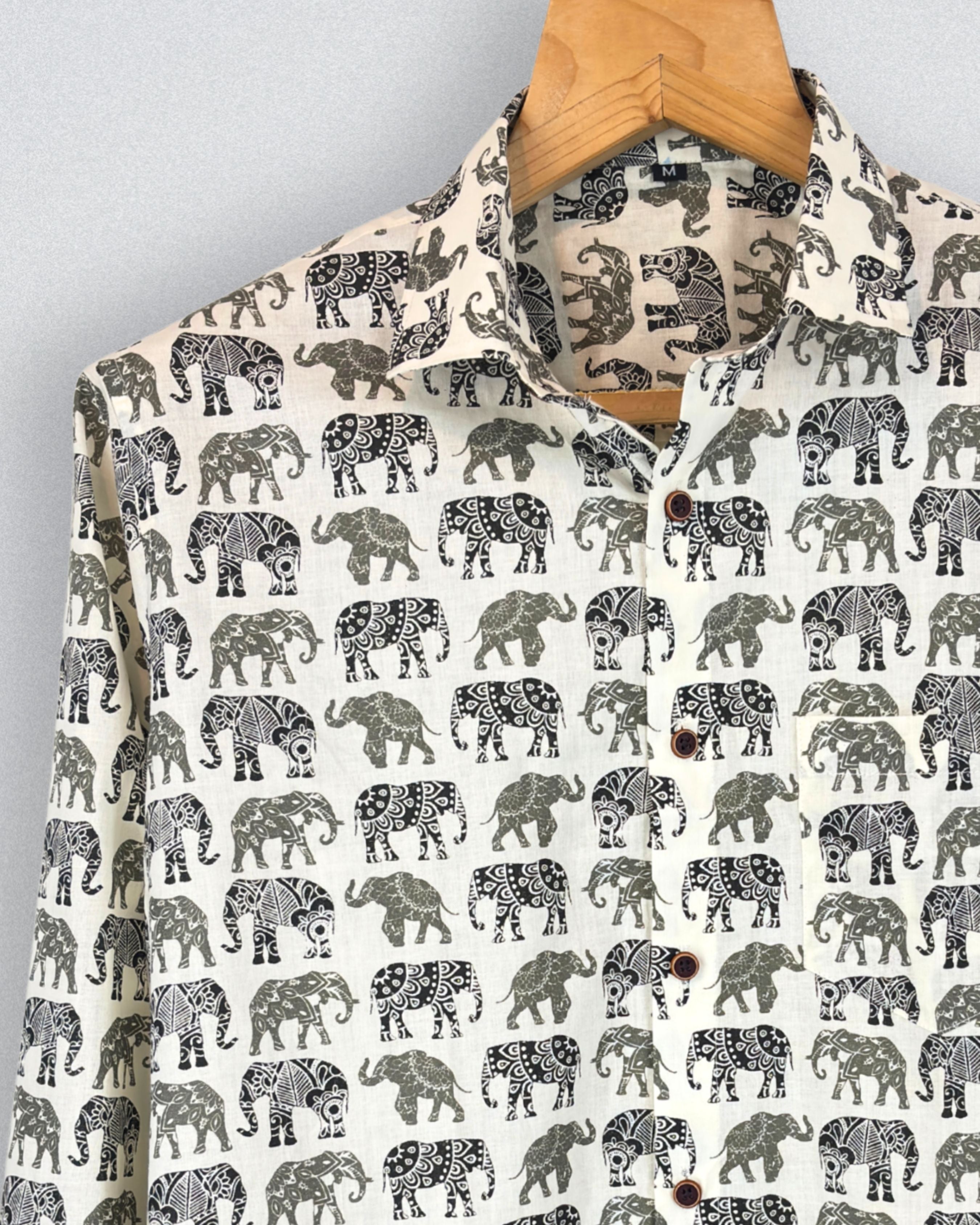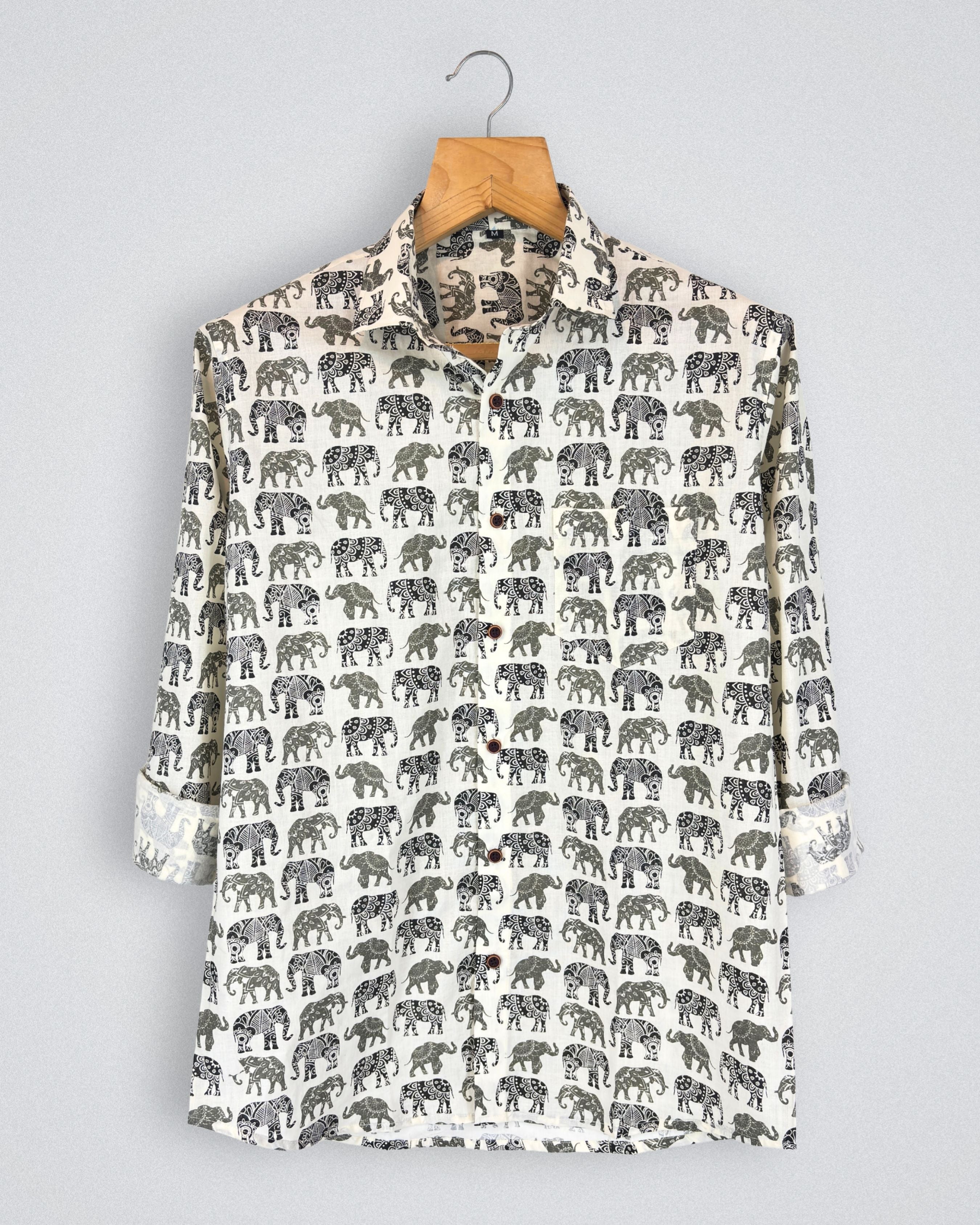 Step into the wild with our Elephant Charm by Jaipuri Crown – a trendy Full sleeve cotton shirt featuring an intricate elephant print in grey and black on a soft cream background. Made from 100% Sanganeri cotton, this shirt ensures comfort and breathability, making it an ideal choice for casual outings, relaxed weekends, or cultural events.
