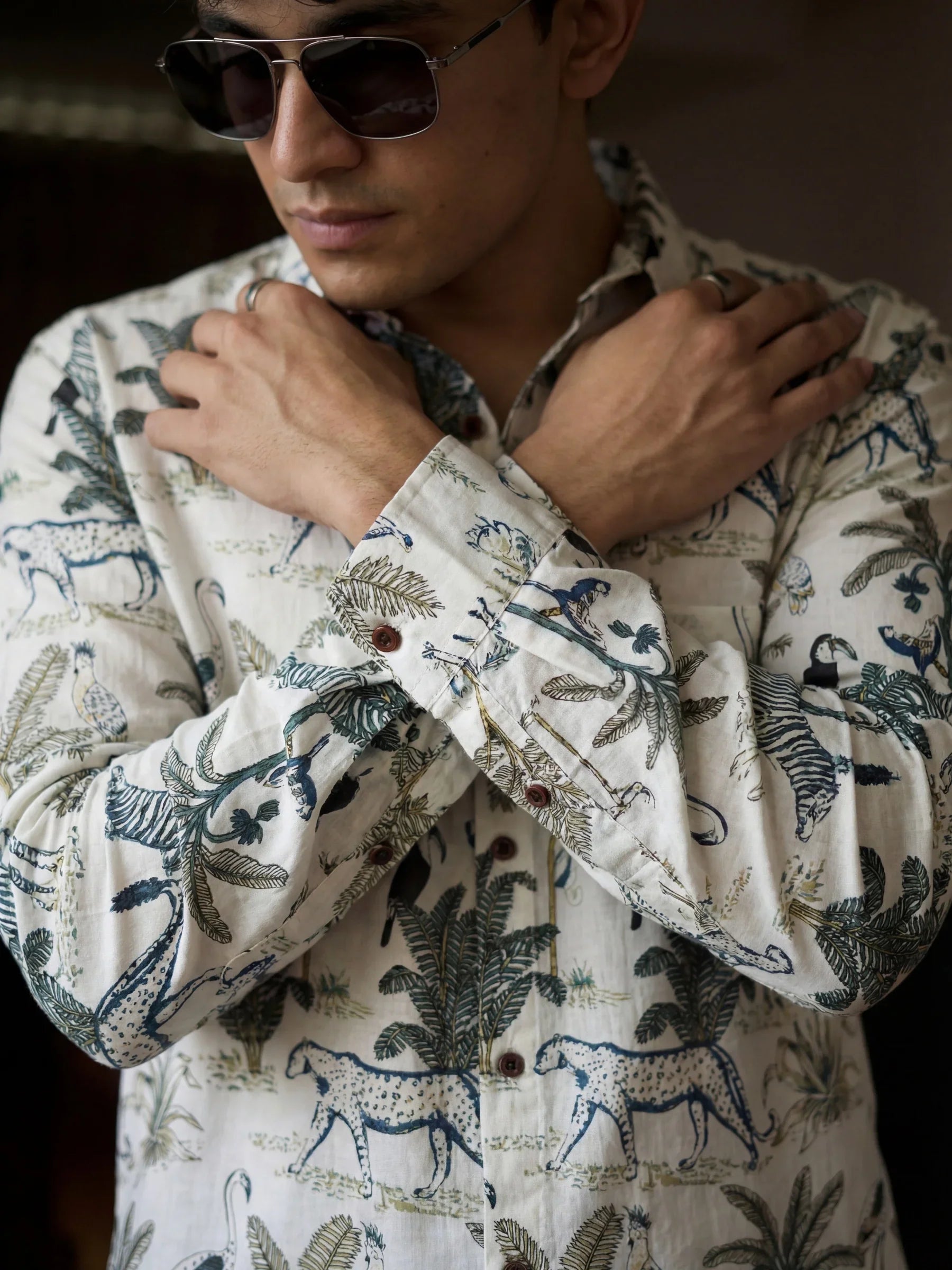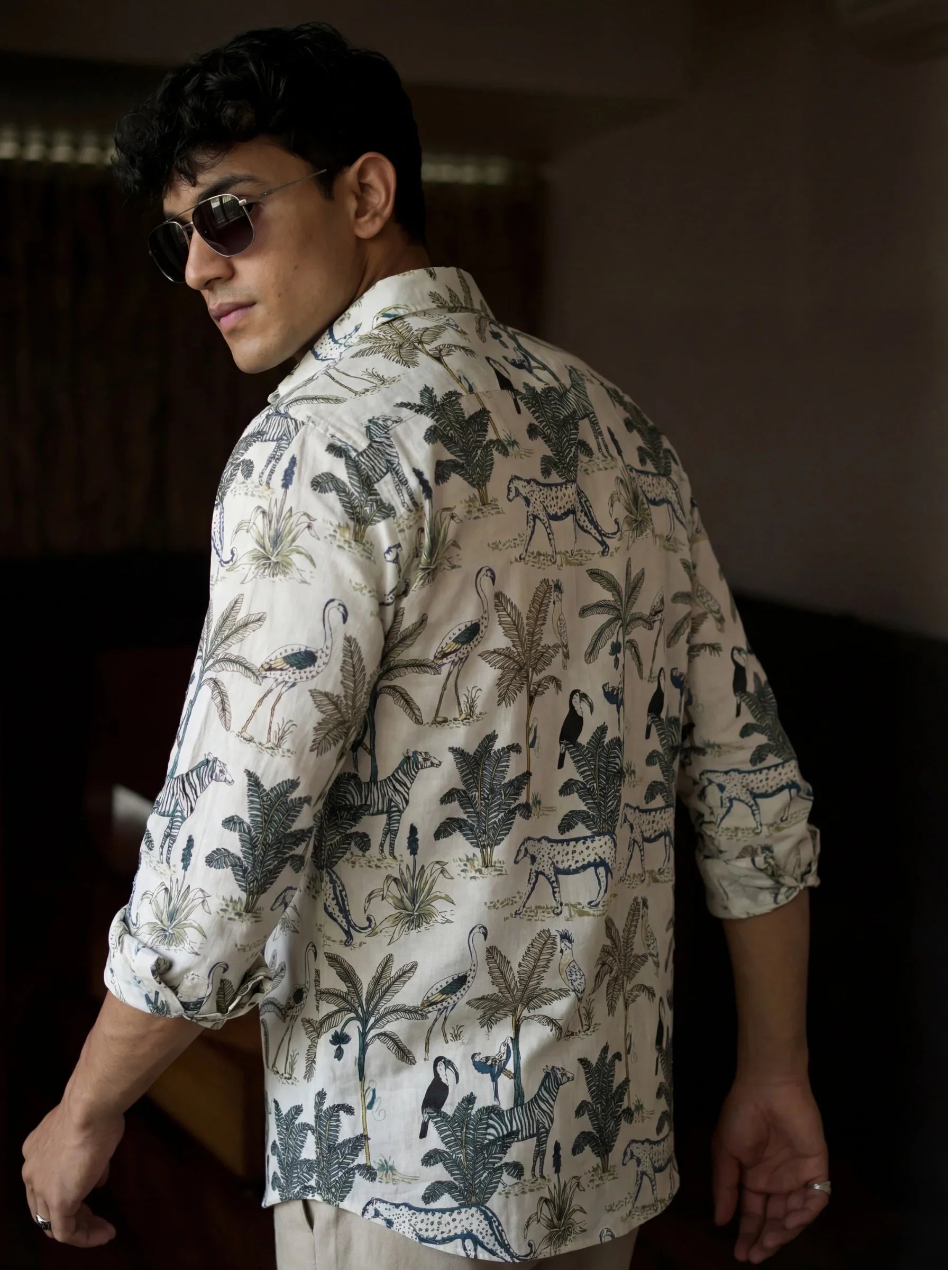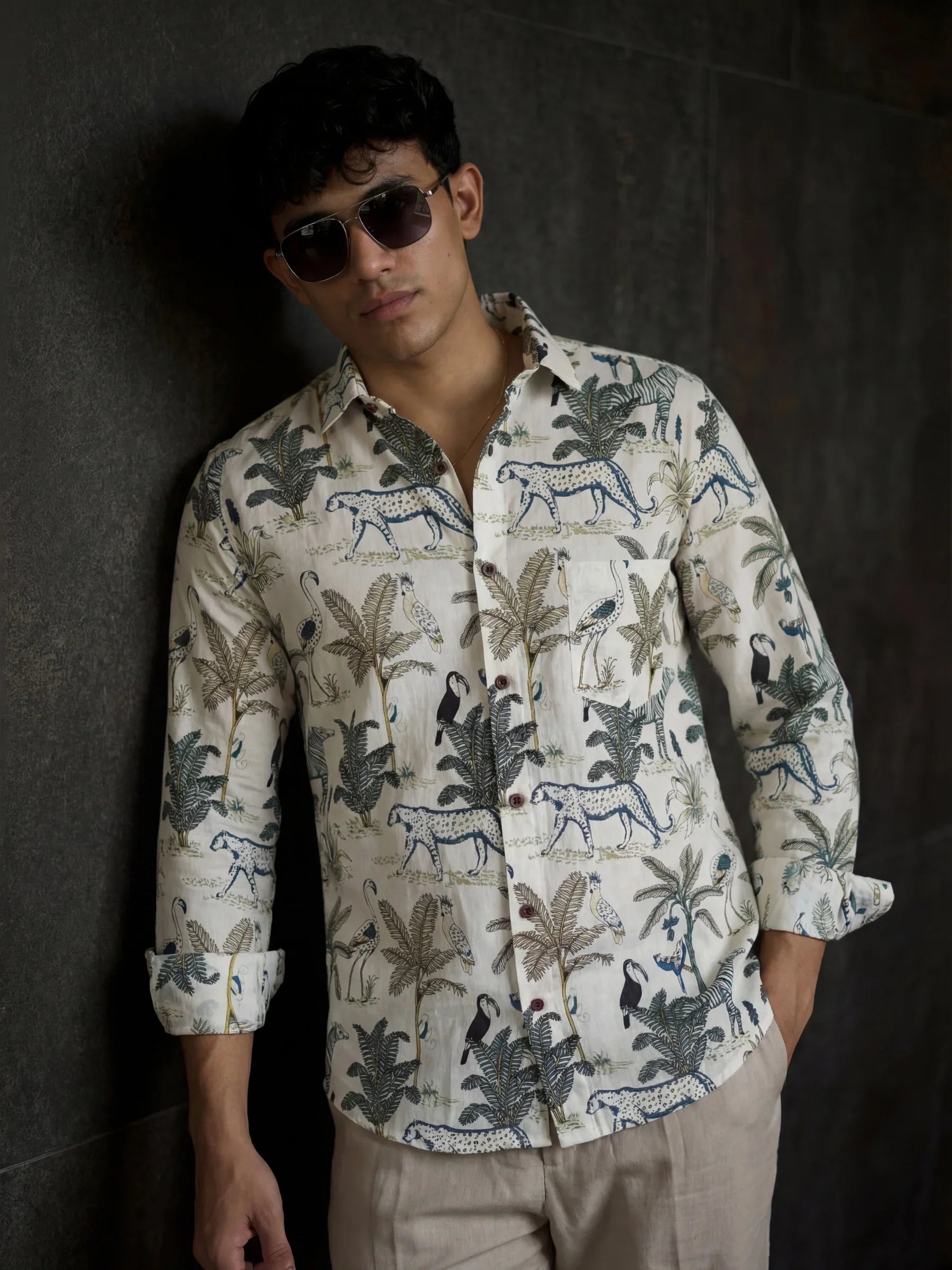 Unleash your adventurous side with Wild Serenade by Jaipuri Crown – a cotton shirt brought to life with striking motifs of leopards, exotic birds, and tropical palms on a cream base. With its full sleeves and relaxed silhouette, this shirt blends the spirit of the wild with breathable elegance, making it a perfect choice for cultural outings, festive occasions, or bold everyday wear.