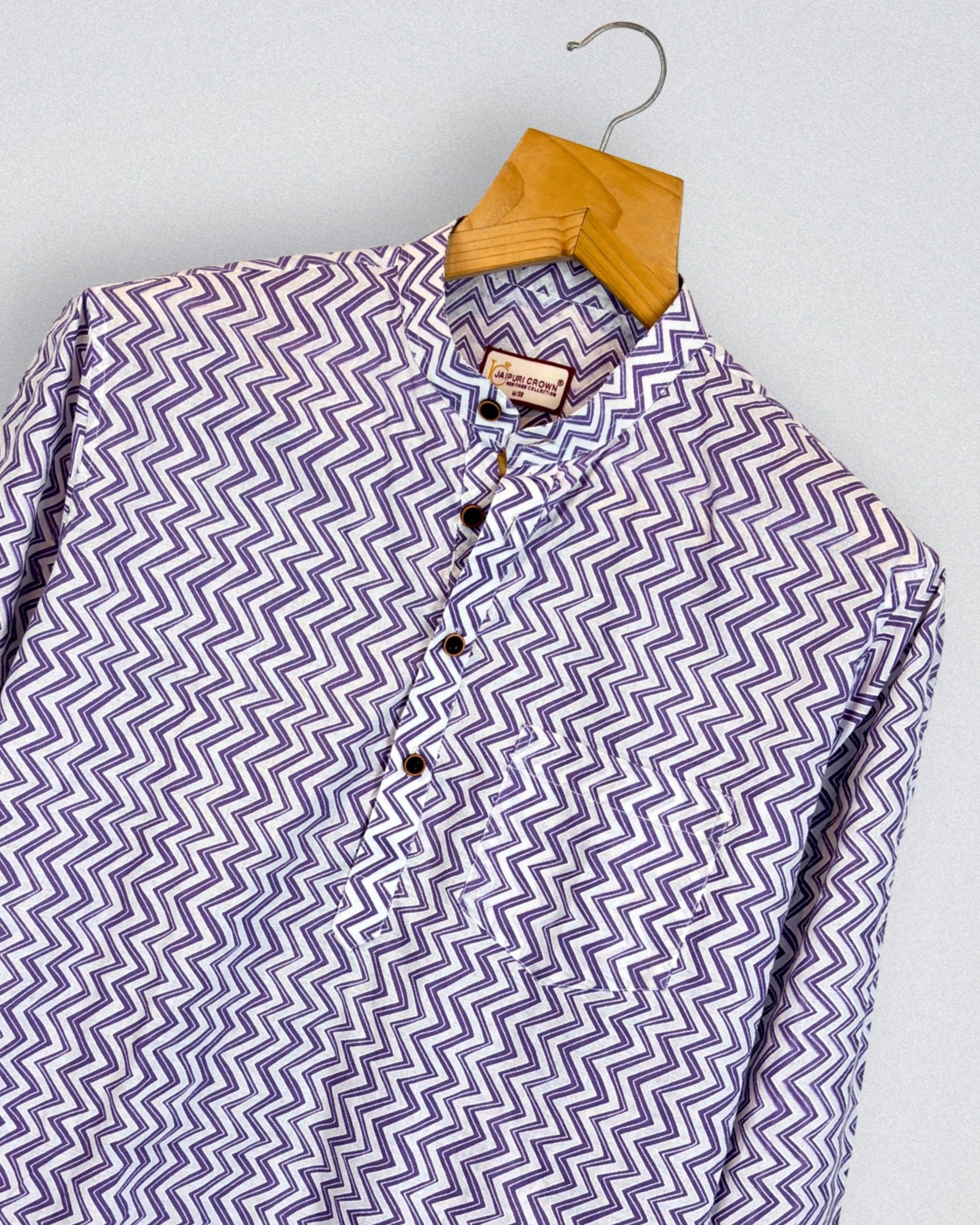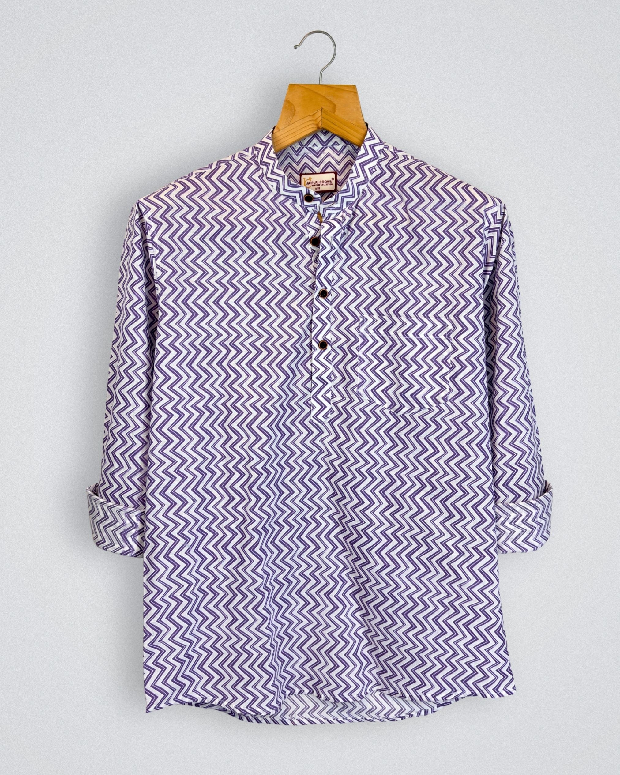 Step into a world of contemporary elegance with the Zigzag Style by Jaipuri Crown. This stylish Short Kurta features a unique zigzag pattern in shades of purple on a crisp white backdrop. Made from 100% Sanganeri cotton, it ensures a soft and breathable fit, making it ideal for casual outings, festive gatherings, or relaxed weekends.