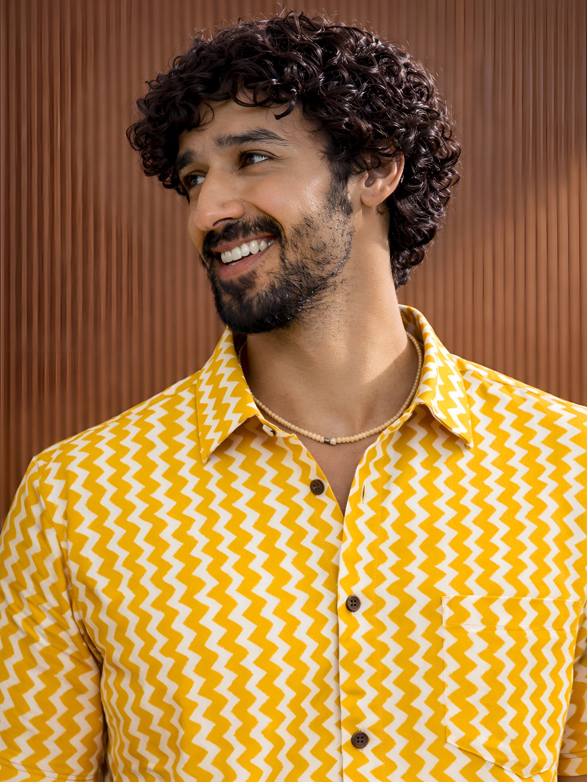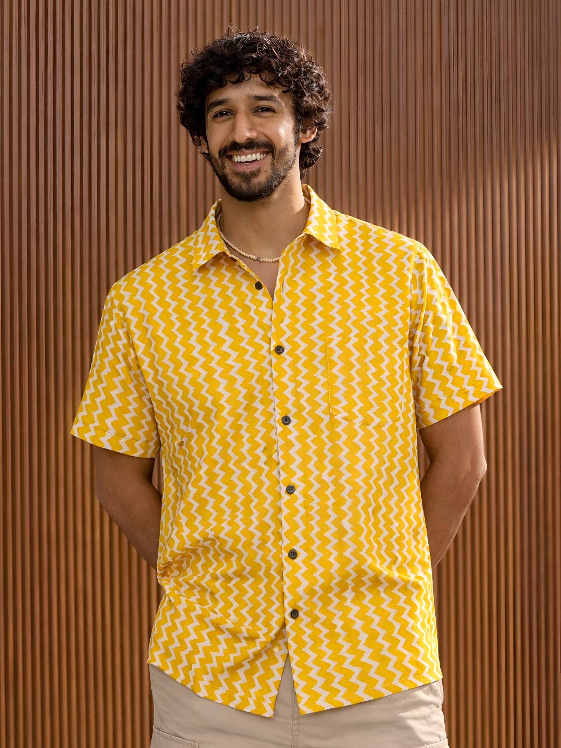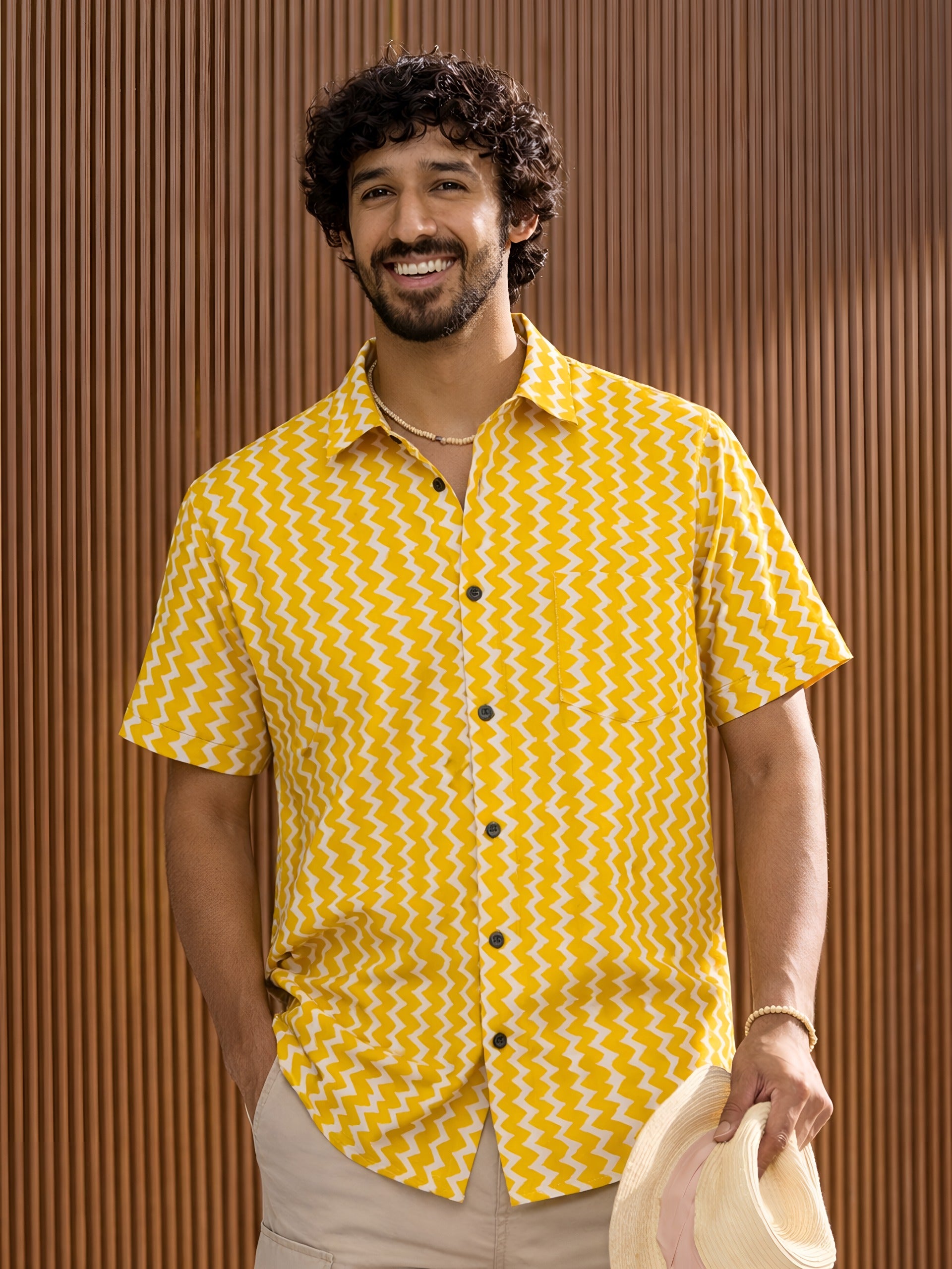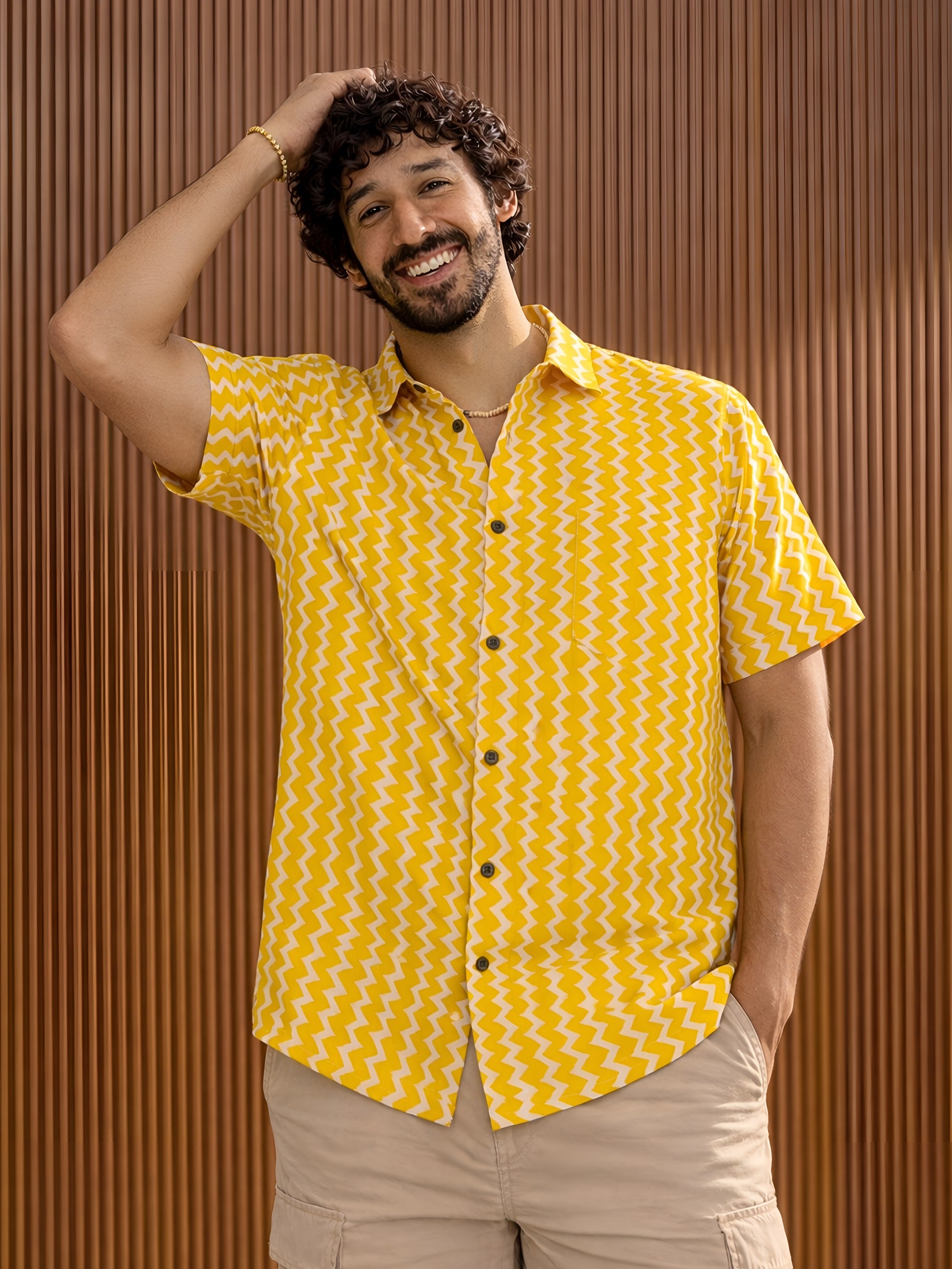 Brighten up your wardrobe with Zigzag Sunshine by Jaipuri Crown – a vibrant half sleeve cotton shirt featuring a playful zigzag pattern in sunny yellow and white. Made from 100% Sanganeri cotton, this shirt is designed for comfort and breathability, making it an ideal choice for casual gatherings, outdoor adventures, or laid-back weekends.